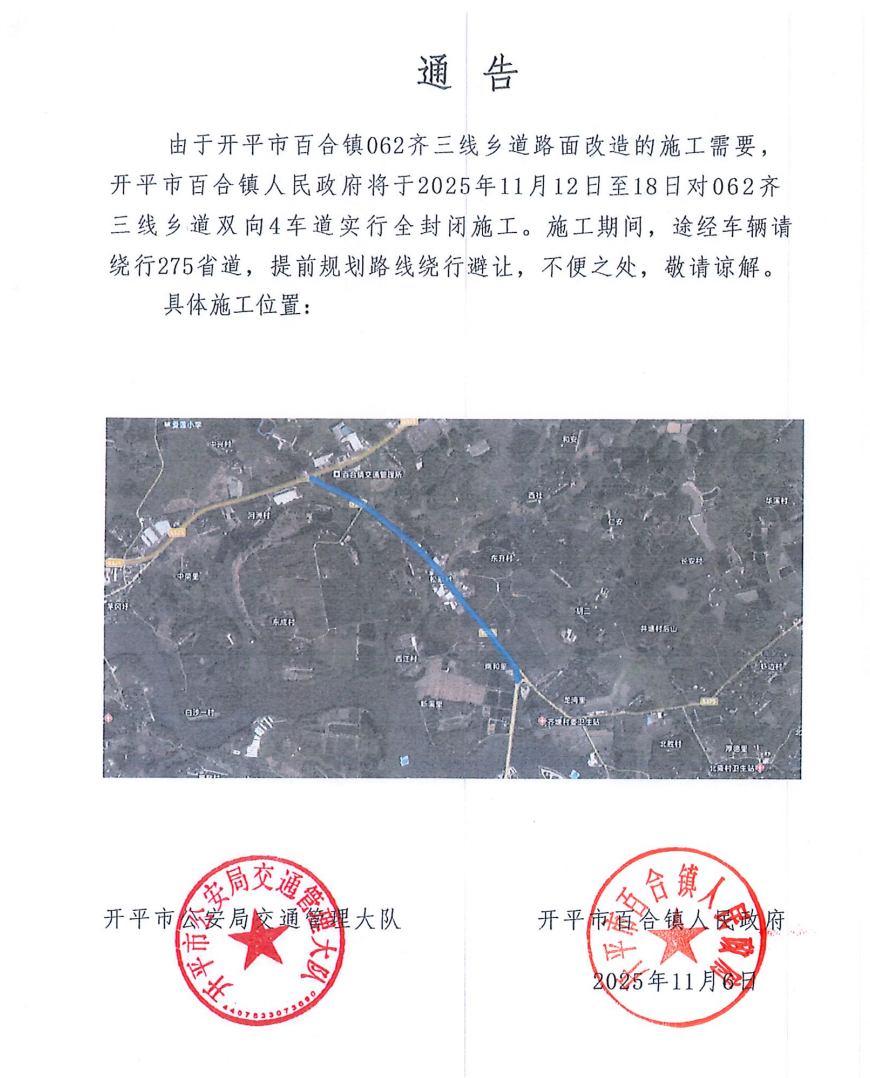 由于開(kāi)平市百合鎮(zhèn)062齊三線鄉(xiāng)道路面改造的施工需要,開(kāi)平市百合鎮(zhèn)人民政府將于2025年11月12日至18日對(duì)062齊三線鄉(xiāng)道雙向4車道實(shí)行全封閉施工。施工期間,途經(jīng)車輛請(qǐng)繞行275省道,提前規(guī)劃路線繞行避讓,不便之處,敬請(qǐng)諒解。
