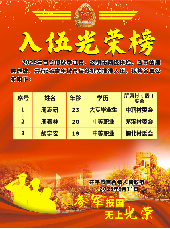 2025年秋季征兵工作開展以來(lái),百合鎮(zhèn)廣大適齡青年積極響應(yīng)祖國(guó)號(hào)召,踴躍報(bào)名參軍,經(jīng)過(guò)嚴(yán)格挑選、層層把關(guān),共有3名優(yōu)秀青年被批準(zhǔn)入伍,將分批啟程奔赴軍營(yíng)。