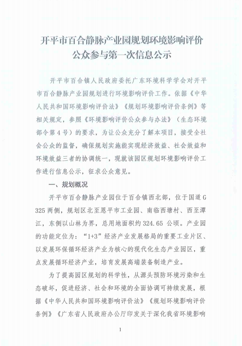 開(kāi)平市百合靜脈產(chǎn)業(yè)園規(guī)劃環(huán)境影響評(píng)價(jià)公眾參與第一次信息公示