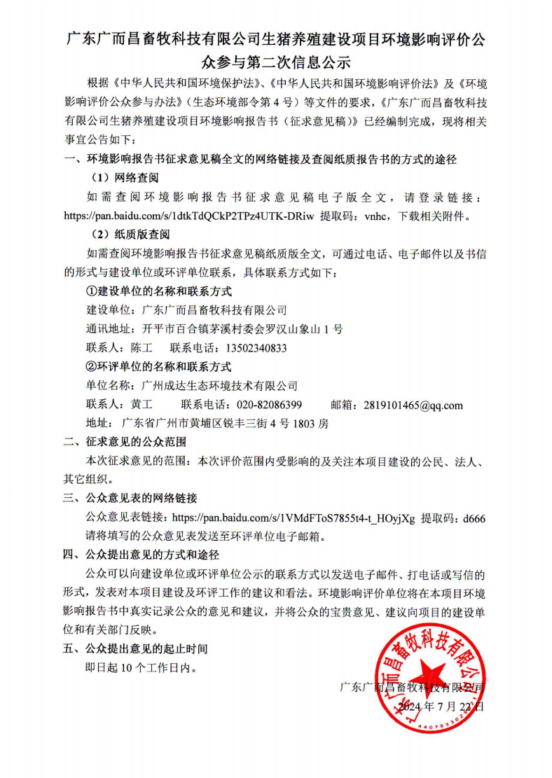 廣東廣而昌畜牧科技有限公司生豬養(yǎng)殖建設(shè)項目環(huán)境影響評價公眾參與第二次信息公示