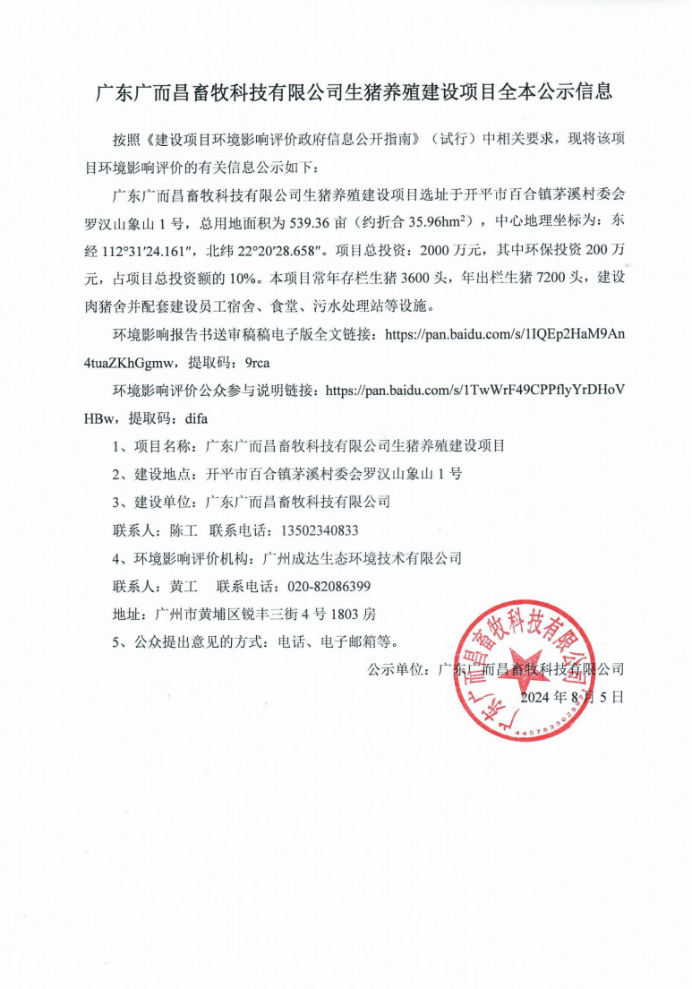 廣東廣而昌畜牧科技有限公司生豬養(yǎng)殖建設(shè)項(xiàng)目全本公示信息