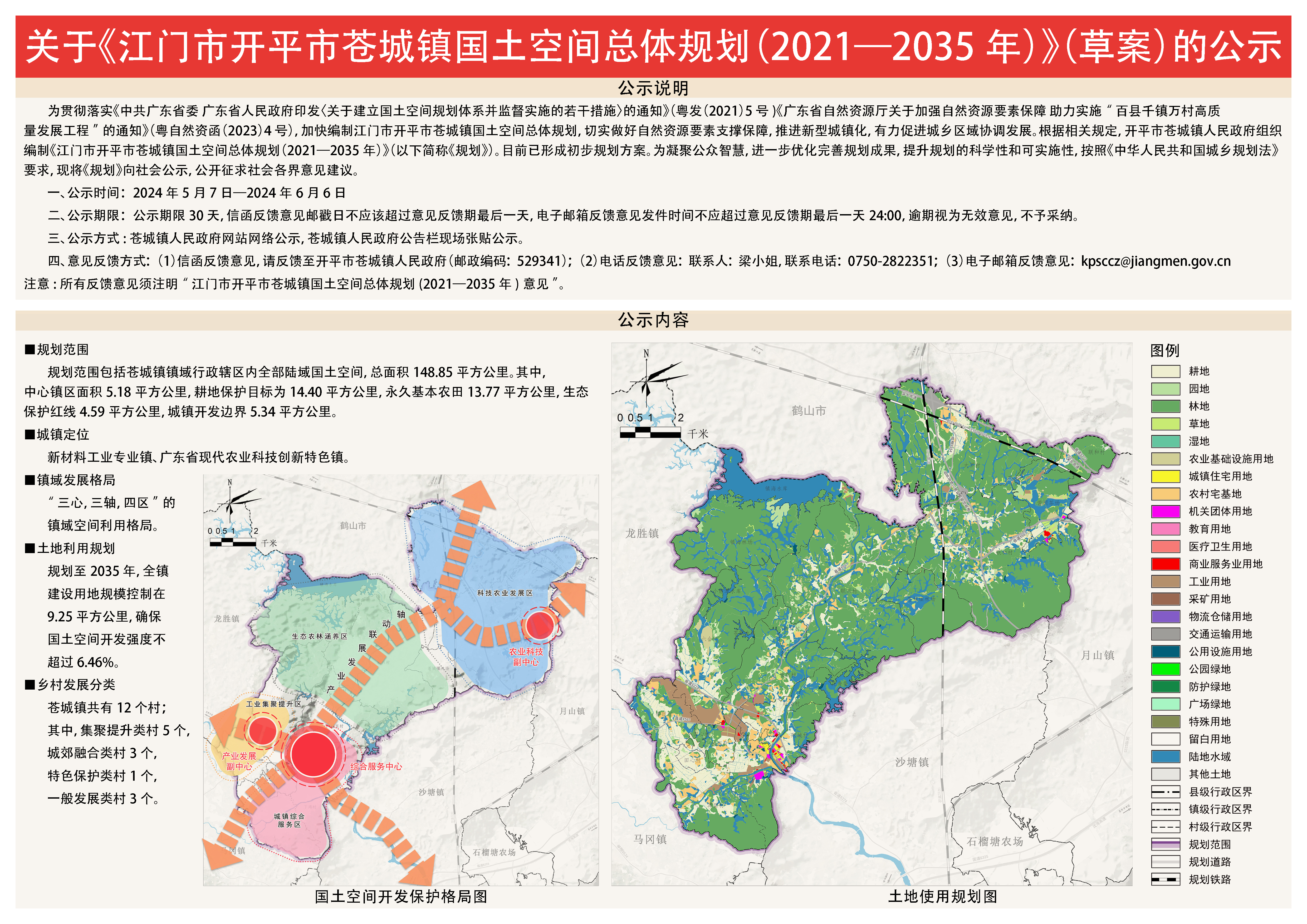 助力實施“百縣千鎮(zhèn)萬村高質(zhì)量發(fā)展工程”的通知》(粵自然資函(2023)4號),加快編制江門市開平市蒼城鎮(zhèn)國土空間總體規(guī)劃,切實做好自然資源要素支撐保障,推進新型城鎮(zhèn)化,有力促進城鄉(xiāng)區(qū)域協(xié)調(diào)發(fā)展。根據(jù)相關(guān)規(guī)定,開平市蒼城鎮(zhèn)人民政府組織編制《江門市開平市蒼城鎮(zhèn)國土空間總體規(guī)劃(2021—2035年)》(以下簡稱《規(guī)劃》)。目前已形成初步規(guī)劃方案。為凝聚公眾智慧,進一步優(yōu)化完善規(guī)劃成果,提升規(guī)劃的科學(xué)性和可實施性,按照《中華人民共和國城鄉(xiāng)規(guī)劃法》要求,現(xiàn)將《規(guī)劃》向社會公示,公開征求社會各界意見建議: 公示時間:2024年5月7日至2024年6月6日