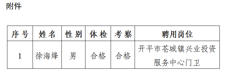 根據(jù)有關(guān)招聘公告,經(jīng)面試、體檢、考察等環(huán)節(jié),現(xiàn)對擬聘用人員予以公示(公示名單詳見附件)。 公示時(shí)間為2025年9月27日至2025年9月29日止。公示期間,如對擬聘用人員有異議的,可通過來訪、來電、來信等方式向我單位反映(受理地點(diǎn):開平市蒼城鎮(zhèn)西門街38號,郵編:529341,電話:0750-2828136)。反映情況和問題必須實(shí)事求是,反映人須提供真實(shí)姓名、聯(lián)系電話等以示負(fù)責(zé)。 我單位將對反映人信息嚴(yán)格保密,按規(guī)定對所反映的情況和問題認(rèn)真調(diào)查處理,并視情況以適當(dāng)方式向反映人反饋。經(jīng)調(diào)查反映問題影響聘用的,將取消擬聘用人員的聘用資格。 公示期滿無異議或不影響聘用的,按規(guī)定辦理聘用手續(xù)。 開平市蒼城鎮(zhèn)興業(yè)投資服務(wù)中心 2025年9月26日