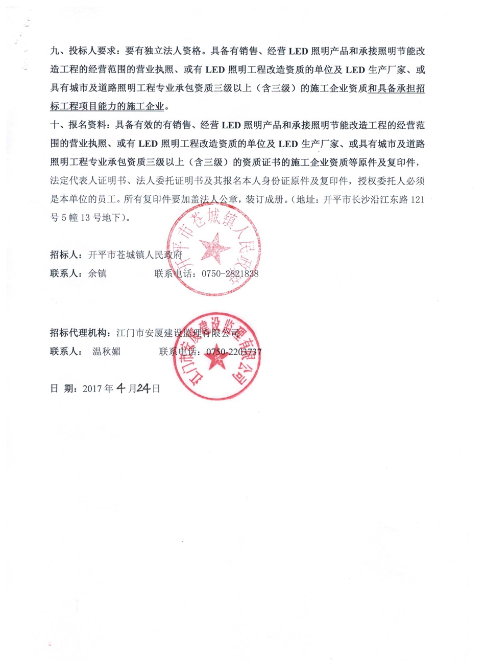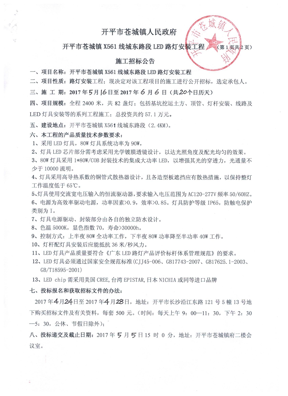 開平市蒼城鎮(zhèn)X561線城東路段LED路燈安裝工程施工招標(biāo)公告