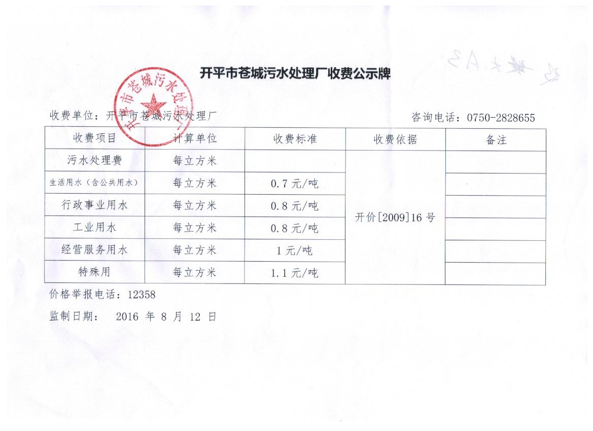 開平市蒼城污水處理廠收費(fèi)公示牌
