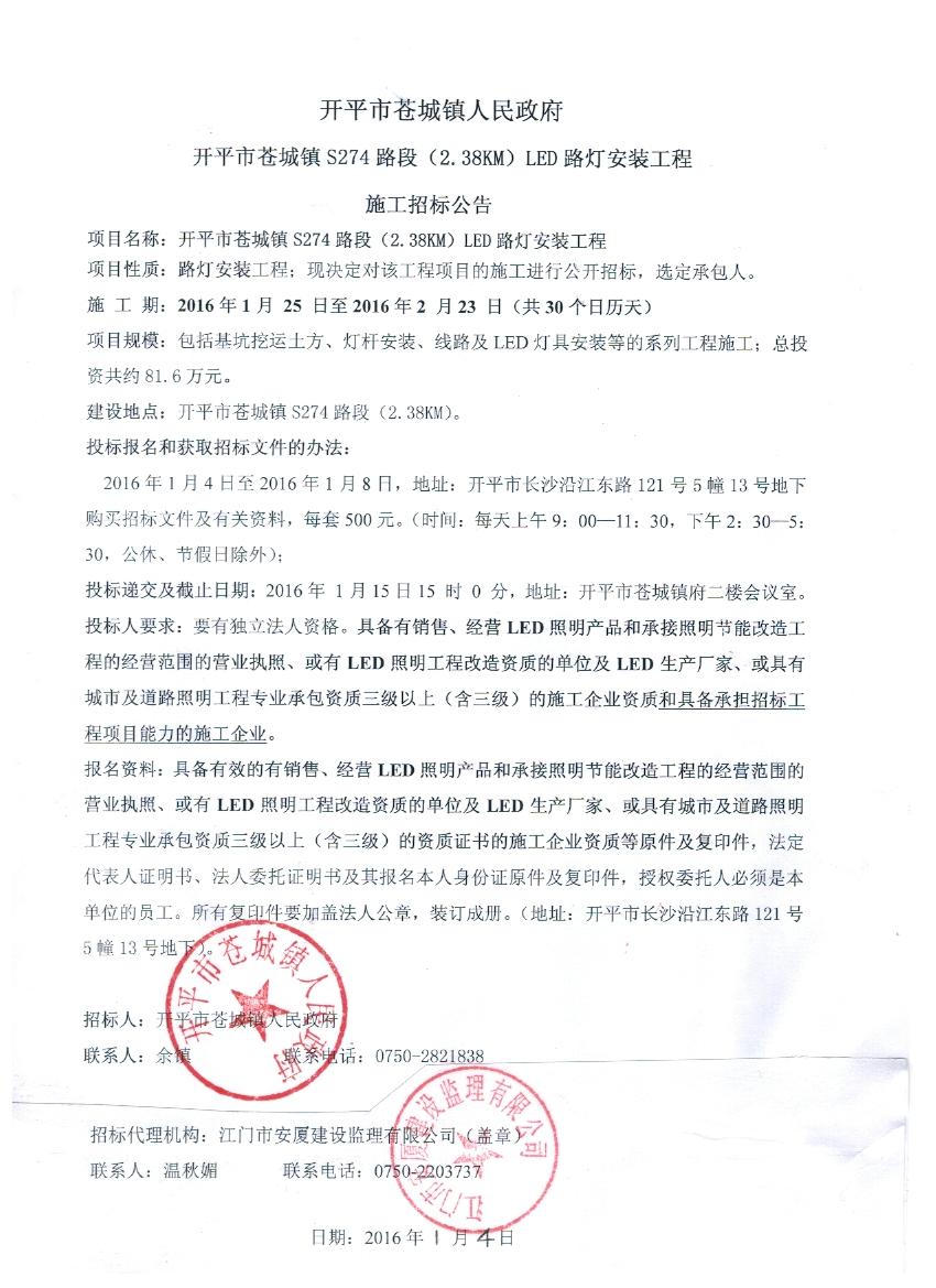 開平市蒼城鎮(zhèn)S274路段(2.38KM)LED路燈安裝工裝施工招標公告