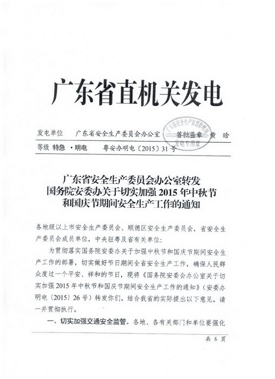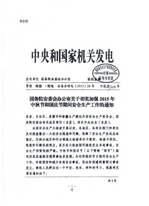 關(guān)于切實加強2015年中秋節(jié)和國慶節(jié)期間安全生產(chǎn)工作的通知