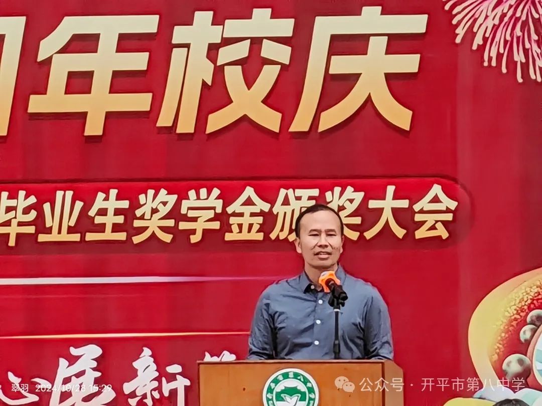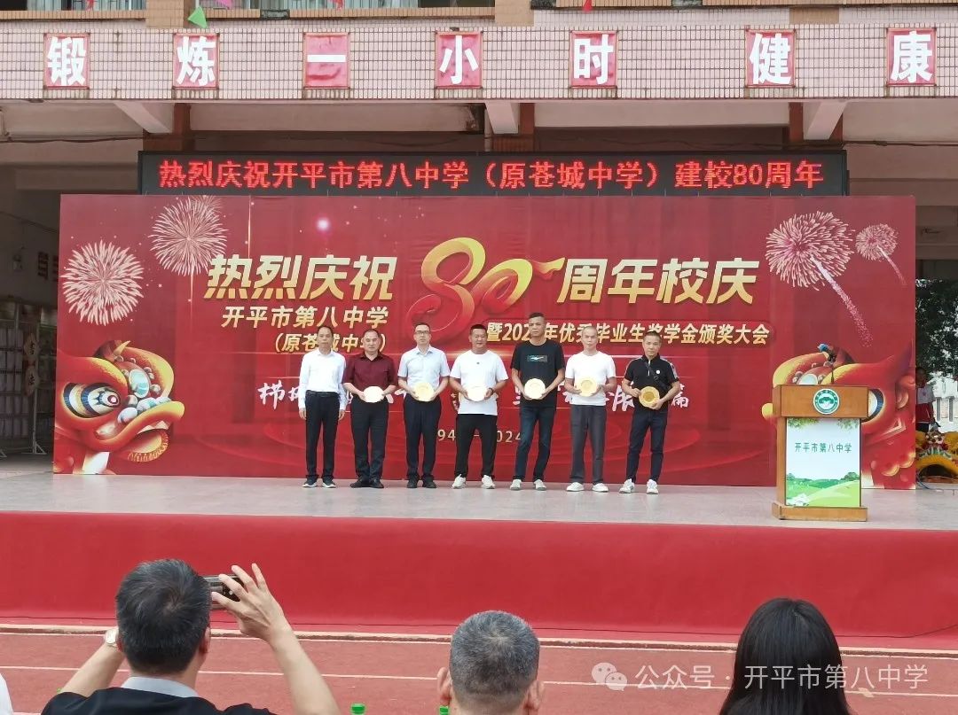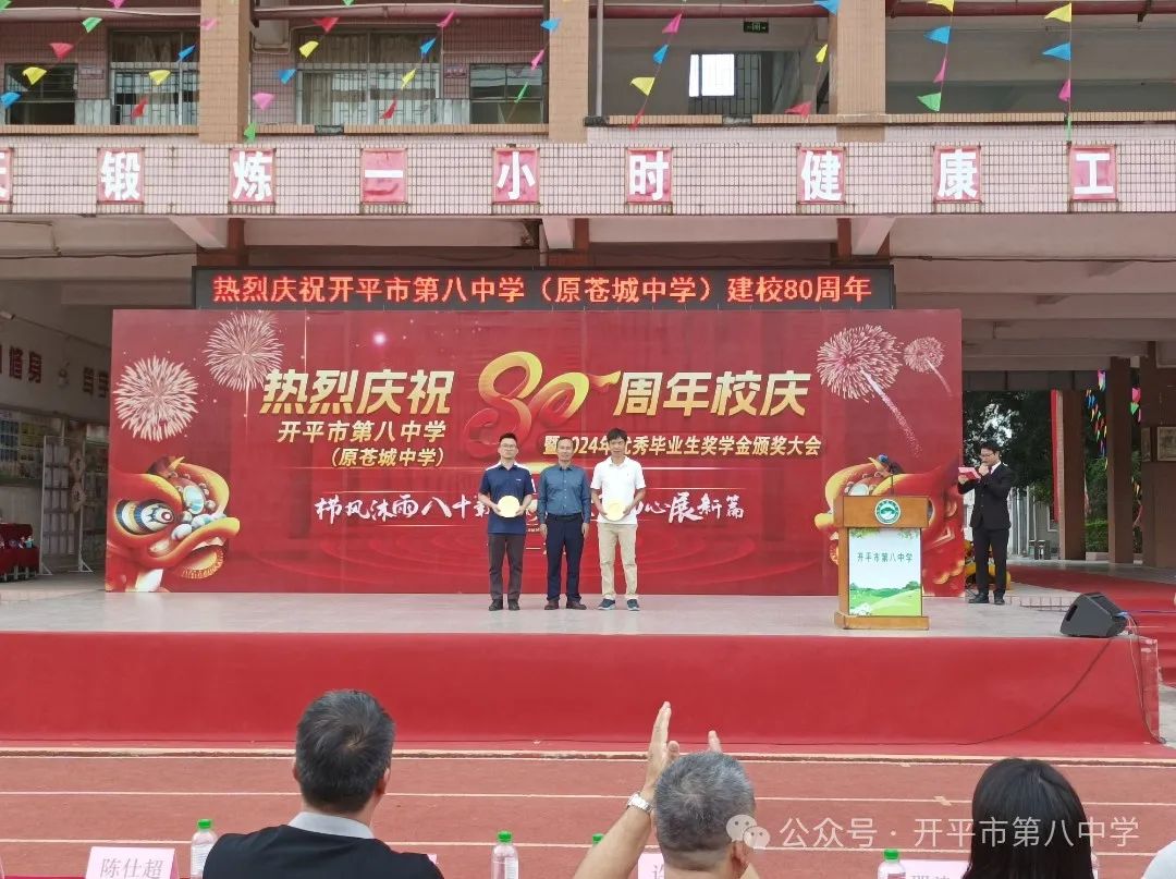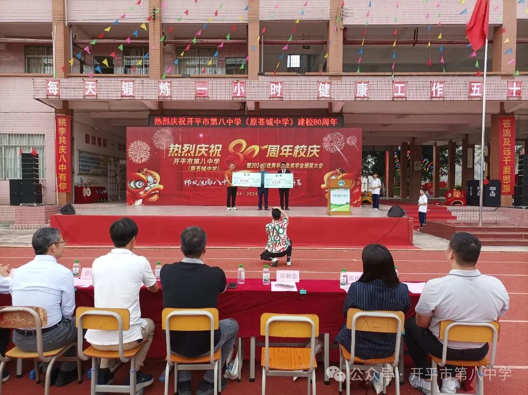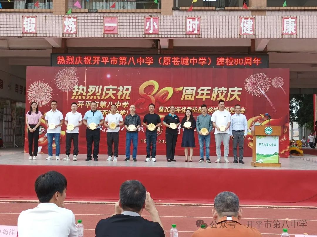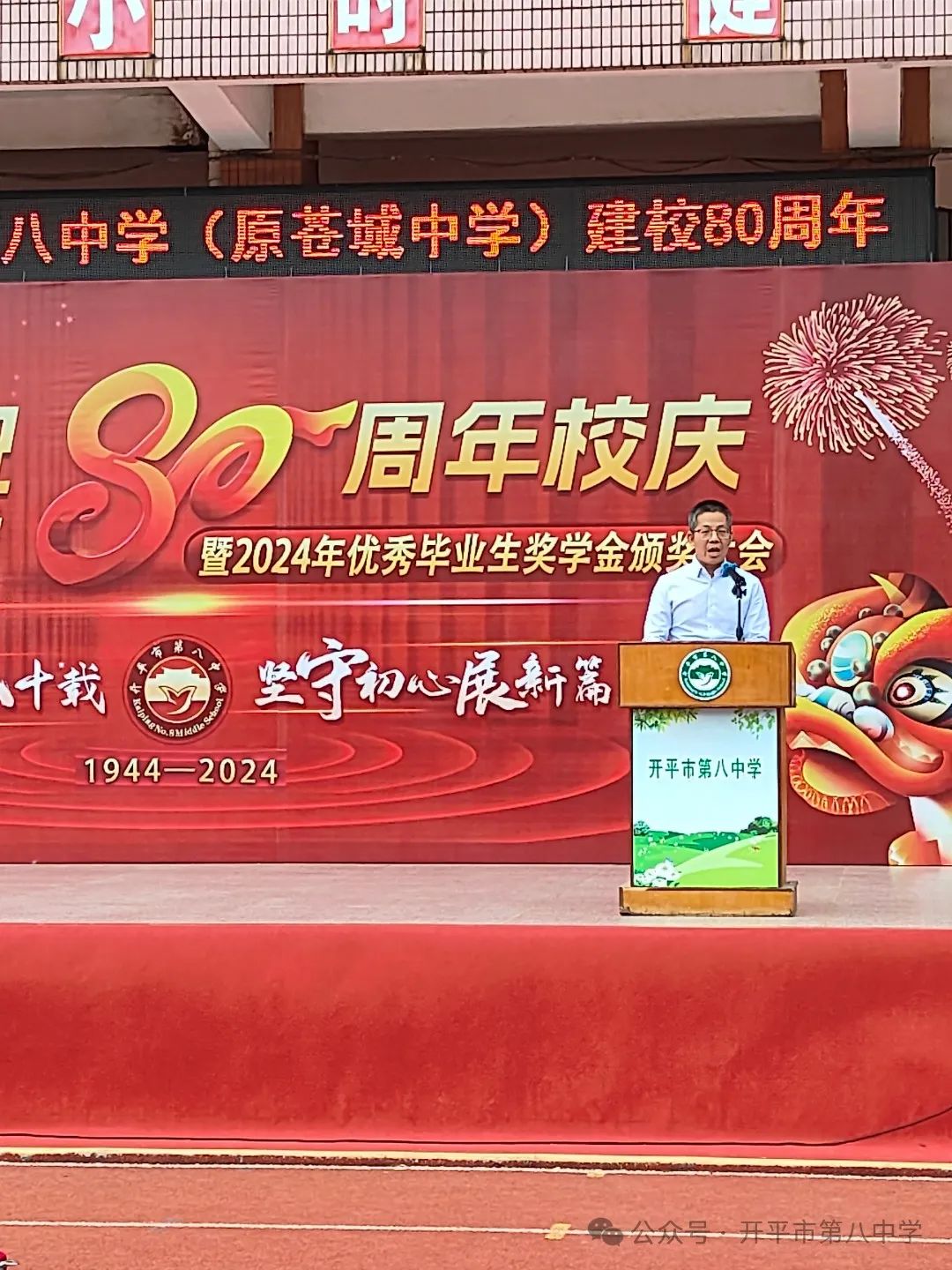 10 月 28 日下午,開平市第八中學(xué)80周年校慶暨2024年優(yōu)秀畢業(yè)生獎學(xué)金頒獎大會活動盛大舉行。出席本次活動的有蒼城鎮(zhèn)許海祥鎮(zhèn)長、李婷婷副鎮(zhèn)長、開平市教育局領(lǐng)導(dǎo)殷振雄先生、蒼城商會陳仕超會長、羅創(chuàng)平秘書長、一大批熱心校友和社會人士、2024屆優(yōu)秀畢業(yè)生以及開平八中全體師生共1000余人。 1 足跡與回憶 活動伊始,校友們紛紛簽到入場,在簽到處留下對母校的深情祝福與關(guān)懷。欣賞八中的書香畫意和面塑特色展示,尋找自己曾在校園留下的腳印。隨后,一場氣勢磅礴的醒獅表演瞬間點燃了現(xiàn)場氣氛,為校慶活動拉開了精彩序幕。 2 詩朗誦 詩朗誦節(jié)目《八十春秋抒懷》緊隨其后,謝諾柔、黃敏蘭、周子浩、勞均霖四位同學(xué)用真摯的情感和激昂的語調(diào),歌頌了學(xué)校的光輝歷程和深厚底蘊。 3 校長致辭 戴松校長在致辭中回顧學(xué)校的八十年發(fā)展與成就都離不開政府、各企業(yè)、個人和校友們的大力支持,并展望未來的發(fā)展藍圖,充滿了對學(xué)校的熱愛與期望。 4 校友發(fā)言 余健成校友代表發(fā)言,分享了自己在母校的點滴回憶和畢業(yè)后的拼搏歷程,激勵著學(xué)弟學(xué)妹們勇敢前行。 5 會長講話 蒼城商會陳仕超會長也發(fā)表了熱情洋溢的講話,表達了對學(xué)校教學(xué)成績的認可以及對教育事業(yè)的支持,希望八中勤學(xué)、善學(xué)的學(xué)風(fēng)代代相傳。 6 表彰優(yōu)秀畢業(yè)生 蒼城鎮(zhèn)陳仕超會長、羅創(chuàng)平秘書長為優(yōu)秀畢業(yè)生頒發(fā)獎勵,表彰他們的卓越表現(xiàn)。 7 愛心傳遞(一) 戴松校長接收蒼城商會、廣東建邦興業(yè)集團有限公司、優(yōu)秀校友許新忠先生、謝漢弟先生的捐贈支票并為他們頒發(fā)榮譽紀念牌。 8 歌聲送祝福 歌曲《陽光總在風(fēng)雨后》悠揚響起,動人的旋律回蕩在校園,蔡哲軒、馮嘉霖同學(xué)用歌聲為學(xué)校80大誕送上祝福。 9 愛心傳遞(二) 隨后,許海祥鎮(zhèn)長、李婷婷副鎮(zhèn)長為熱心企業(yè)和校友們頒發(fā)校友榮譽紀念牌,感謝所有關(guān)心與支持學(xué)校發(fā)展的企業(yè)和校友們。 10 鎮(zhèn)長講話 蒼城鎮(zhèn)鎮(zhèn)長許海祥先生的講話為學(xué)校帶來了更多的鼓舞與動力,肯定了學(xué)校在教育領(lǐng)域的突出成績,并表示將一如既往地支持學(xué)校發(fā)展。 11 籃球操表演 活力四射的籃球操表演展現(xiàn)了學(xué)生們的青春風(fēng)采,讓現(xiàn)場氣氛再顯活躍,掌聲喝彩不斷。 12 共享美食 校慶活動的最后環(huán)節(jié),全體嘉賓校友和全體師生一起參與各班級精心準備的美食分享會,在同學(xué)們的熱心招待中重新感受到校園生活的美好。 來源:開平市第八中學(xué)