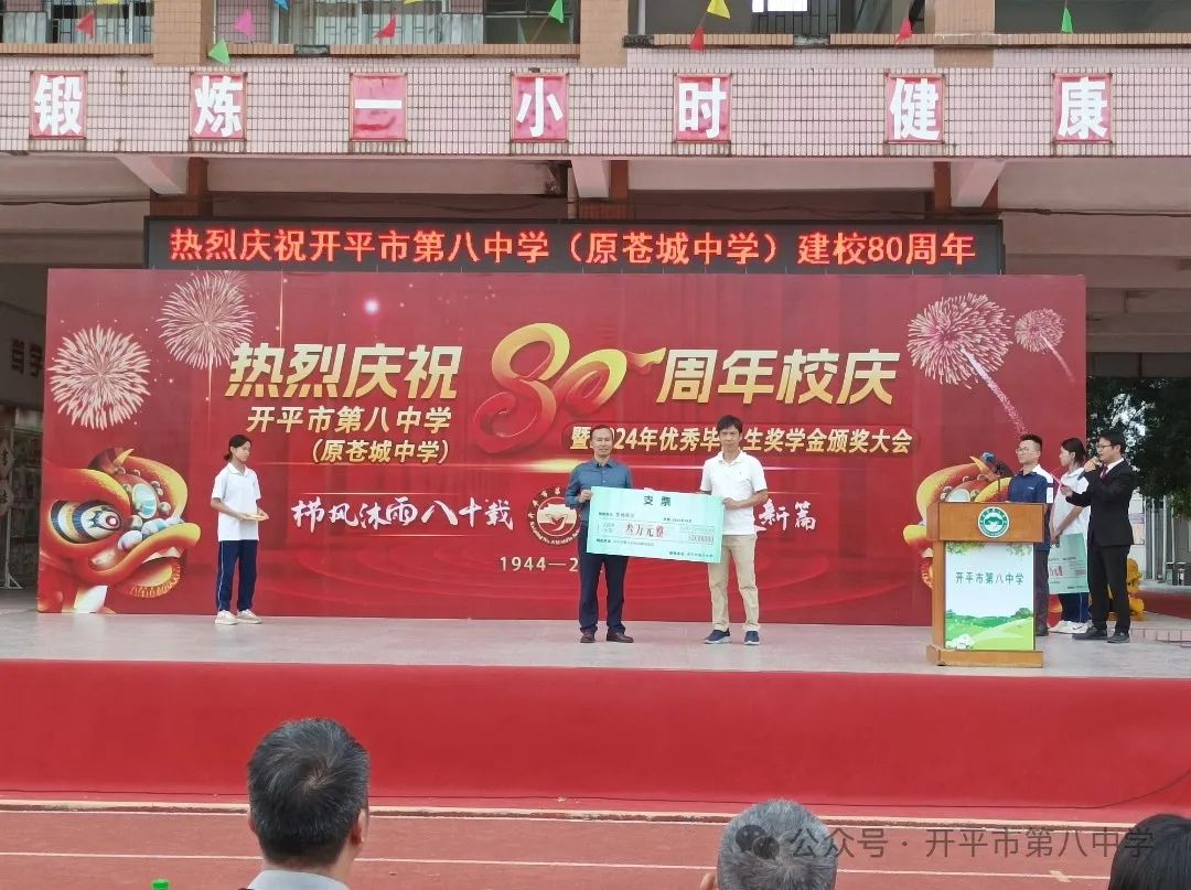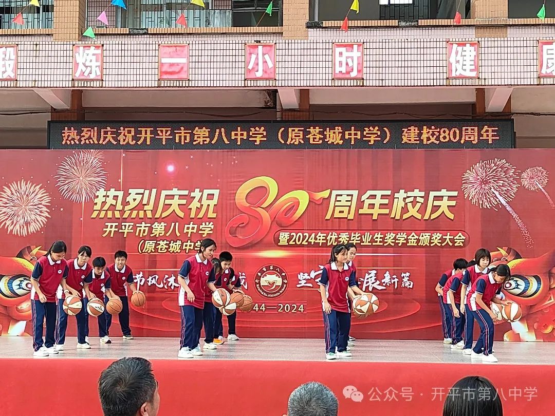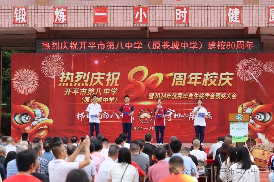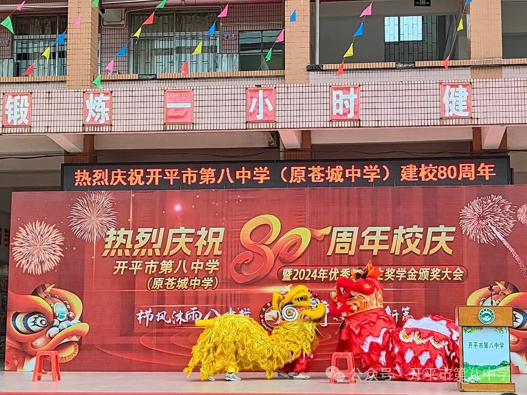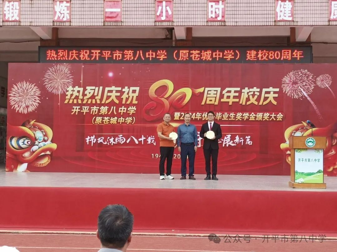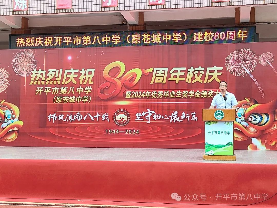 10 月 28 日下午,開平市第八中學(xué)80周年校慶暨2024年優(yōu)秀畢業(yè)生獎學(xué)金頒獎大會活動盛大舉行。出席本次活動的有蒼城鎮(zhèn)許海祥鎮(zhèn)長、李婷婷副鎮(zhèn)長、開平市教育局領(lǐng)導(dǎo)殷振雄先生、蒼城商會陳仕超會長、羅創(chuàng)平秘書長、一大批熱心校友和社會人士、2024屆優(yōu)秀畢業(yè)生以及開平八中全體師生共1000余人。 1 足跡與回憶 活動伊始,校友們紛紛簽到入場,在簽到處留下對母校的深情祝福與關(guān)懷。欣賞八中的書香畫意和面塑特色展示,尋找自己曾在校園留下的腳印。隨后,一場氣勢磅礴的醒獅表演瞬間點燃了現(xiàn)場氣氛,為校慶活動拉開了精彩序幕。 2 詩朗誦 詩朗誦節(jié)目《八十春秋抒懷》緊隨其后,謝諾柔、黃敏蘭、周子浩、勞均霖四位同學(xué)用真摯的情感和激昂的語調(diào),歌頌了學(xué)校的光輝歷程和深厚底蘊。 3 校長致辭 戴松校長在致辭中回顧學(xué)校的八十年發(fā)展與成就都離不開政府、各企業(yè)、個人和校友們的大力支持,并展望未來的發(fā)展藍圖,充滿了對學(xué)校的熱愛與期望。 4 校友發(fā)言 余健成校友代表發(fā)言,分享了自己在母校的點滴回憶和畢業(yè)后的拼搏歷程,激勵著學(xué)弟學(xué)妹們勇敢前行。 5 會長講話 蒼城商會陳仕超會長也發(fā)表了熱情洋溢的講話,表達了對學(xué)校教學(xué)成績的認可以及對教育事業(yè)的支持,希望八中勤學(xué)、善學(xué)的學(xué)風(fēng)代代相傳。 6 表彰優(yōu)秀畢業(yè)生 蒼城鎮(zhèn)陳仕超會長、羅創(chuàng)平秘書長為優(yōu)秀畢業(yè)生頒發(fā)獎勵,表彰他們的卓越表現(xiàn)。 7 愛心傳遞(一) 戴松校長接收蒼城商會、廣東建邦興業(yè)集團有限公司、優(yōu)秀校友許新忠先生、謝漢弟先生的捐贈支票并為他們頒發(fā)榮譽紀念牌。 8 歌聲送祝福 歌曲《陽光總在風(fēng)雨后》悠揚響起,動人的旋律回蕩在校園,蔡哲軒、馮嘉霖同學(xué)用歌聲為學(xué)校80大誕送上祝福。 9 愛心傳遞(二) 隨后,許海祥鎮(zhèn)長、李婷婷副鎮(zhèn)長為熱心企業(yè)和校友們頒發(fā)校友榮譽紀念牌,感謝所有關(guān)心與支持學(xué)校發(fā)展的企業(yè)和校友們。 10 鎮(zhèn)長講話 蒼城鎮(zhèn)鎮(zhèn)長許海祥先生的講話為學(xué)校帶來了更多的鼓舞與動力,肯定了學(xué)校在教育領(lǐng)域的突出成績,并表示將一如既往地支持學(xué)校發(fā)展。 11 籃球操表演 活力四射的籃球操表演展現(xiàn)了學(xué)生們的青春風(fēng)采,讓現(xiàn)場氣氛再顯活躍,掌聲喝彩不斷。 12 共享美食 校慶活動的最后環(huán)節(jié),全體嘉賓校友和全體師生一起參與各班級精心準備的美食分享會,在同學(xué)們的熱心招待中重新感受到校園生活的美好。 來源:開平市第八中學(xué)