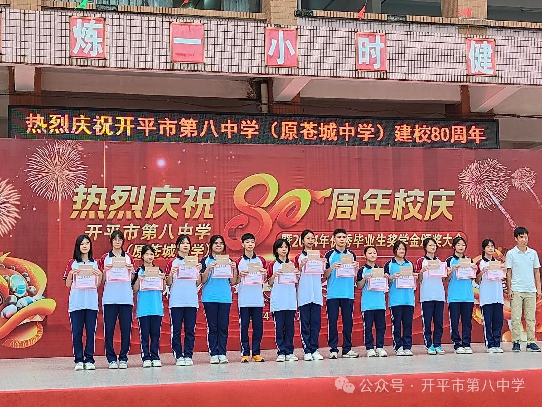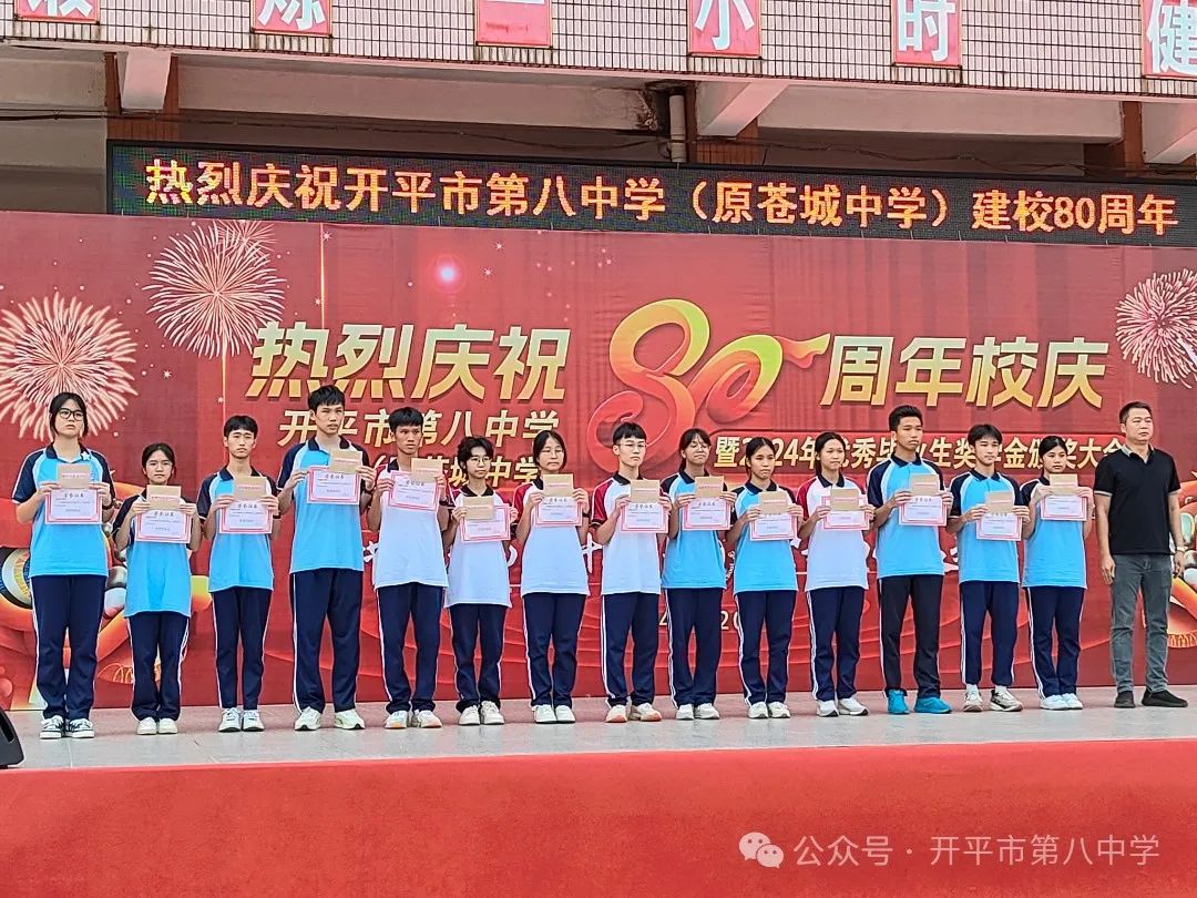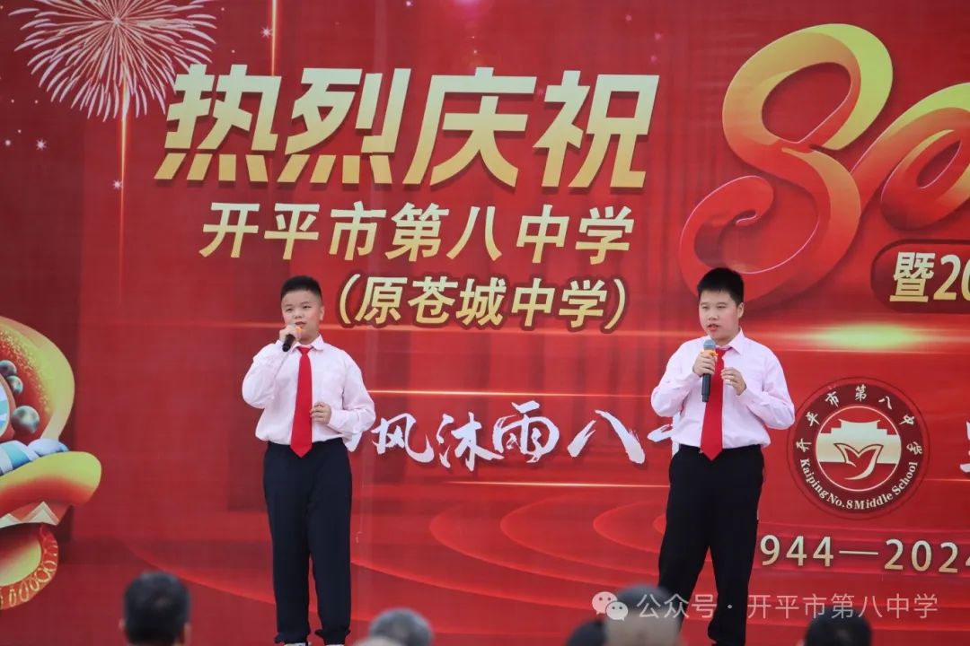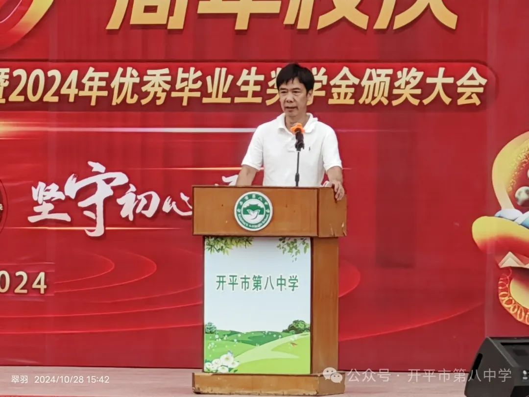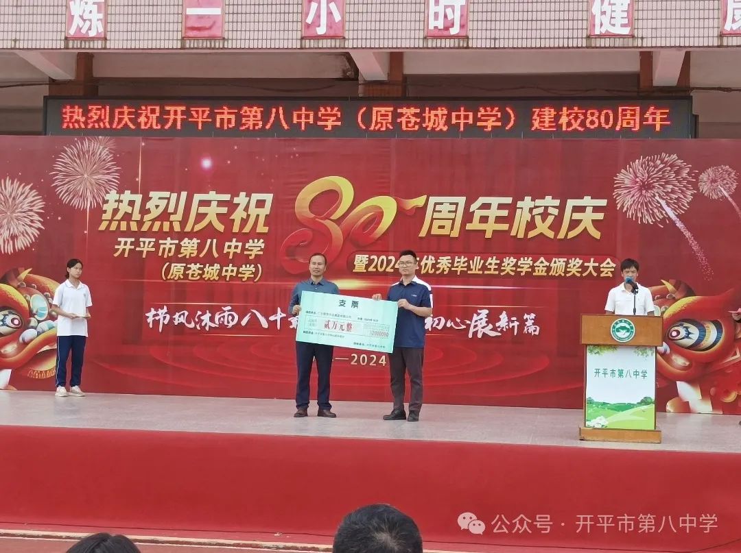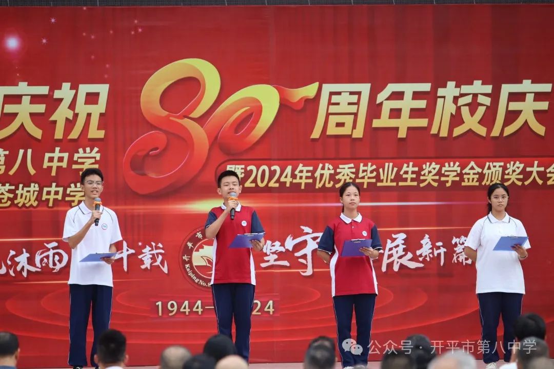 10 月 28 日下午,開平市第八中學(xué)80周年校慶暨2024年優(yōu)秀畢業(yè)生獎學(xué)金頒獎大會活動盛大舉行。出席本次活動的有蒼城鎮(zhèn)許海祥鎮(zhèn)長、李婷婷副鎮(zhèn)長、開平市教育局領(lǐng)導(dǎo)殷振雄先生、蒼城商會陳仕超會長、羅創(chuàng)平秘書長、一大批熱心校友和社會人士、2024屆優(yōu)秀畢業(yè)生以及開平八中全體師生共1000余人。 1 足跡與回憶 活動伊始,校友們紛紛簽到入場,在簽到處留下對母校的深情祝福與關(guān)懷。欣賞八中的書香畫意和面塑特色展示,尋找自己曾在校園留下的腳印。隨后,一場氣勢磅礴的醒獅表演瞬間點燃了現(xiàn)場氣氛,為校慶活動拉開了精彩序幕。 2 詩朗誦 詩朗誦節(jié)目《八十春秋抒懷》緊隨其后,謝諾柔、黃敏蘭、周子浩、勞均霖四位同學(xué)用真摯的情感和激昂的語調(diào),歌頌了學(xué)校的光輝歷程和深厚底蘊。 3 校長致辭 戴松校長在致辭中回顧學(xué)校的八十年發(fā)展與成就都離不開政府、各企業(yè)、個人和校友們的大力支持,并展望未來的發(fā)展藍圖,充滿了對學(xué)校的熱愛與期望。 4 校友發(fā)言 余健成校友代表發(fā)言,分享了自己在母校的點滴回憶和畢業(yè)后的拼搏歷程,激勵著學(xué)弟學(xué)妹們勇敢前行。 5 會長講話 蒼城商會陳仕超會長也發(fā)表了熱情洋溢的講話,表達了對學(xué)校教學(xué)成績的認可以及對教育事業(yè)的支持,希望八中勤學(xué)、善學(xué)的學(xué)風(fēng)代代相傳。 6 表彰優(yōu)秀畢業(yè)生 蒼城鎮(zhèn)陳仕超會長、羅創(chuàng)平秘書長為優(yōu)秀畢業(yè)生頒發(fā)獎勵,表彰他們的卓越表現(xiàn)。 7 愛心傳遞(一) 戴松校長接收蒼城商會、廣東建邦興業(yè)集團有限公司、優(yōu)秀校友許新忠先生、謝漢弟先生的捐贈支票并為他們頒發(fā)榮譽紀念牌。 8 歌聲送祝福 歌曲《陽光總在風(fēng)雨后》悠揚響起,動人的旋律回蕩在校園,蔡哲軒、馮嘉霖同學(xué)用歌聲為學(xué)校80大誕送上祝福。 9 愛心傳遞(二) 隨后,許海祥鎮(zhèn)長、李婷婷副鎮(zhèn)長為熱心企業(yè)和校友們頒發(fā)校友榮譽紀念牌,感謝所有關(guān)心與支持學(xué)校發(fā)展的企業(yè)和校友們。 10 鎮(zhèn)長講話 蒼城鎮(zhèn)鎮(zhèn)長許海祥先生的講話為學(xué)校帶來了更多的鼓舞與動力,肯定了學(xué)校在教育領(lǐng)域的突出成績,并表示將一如既往地支持學(xué)校發(fā)展。 11 籃球操表演 活力四射的籃球操表演展現(xiàn)了學(xué)生們的青春風(fēng)采,讓現(xiàn)場氣氛再顯活躍,掌聲喝彩不斷。 12 共享美食 校慶活動的最后環(huán)節(jié),全體嘉賓校友和全體師生一起參與各班級精心準備的美食分享會,在同學(xué)們的熱心招待中重新感受到校園生活的美好。 來源:開平市第八中學(xué)