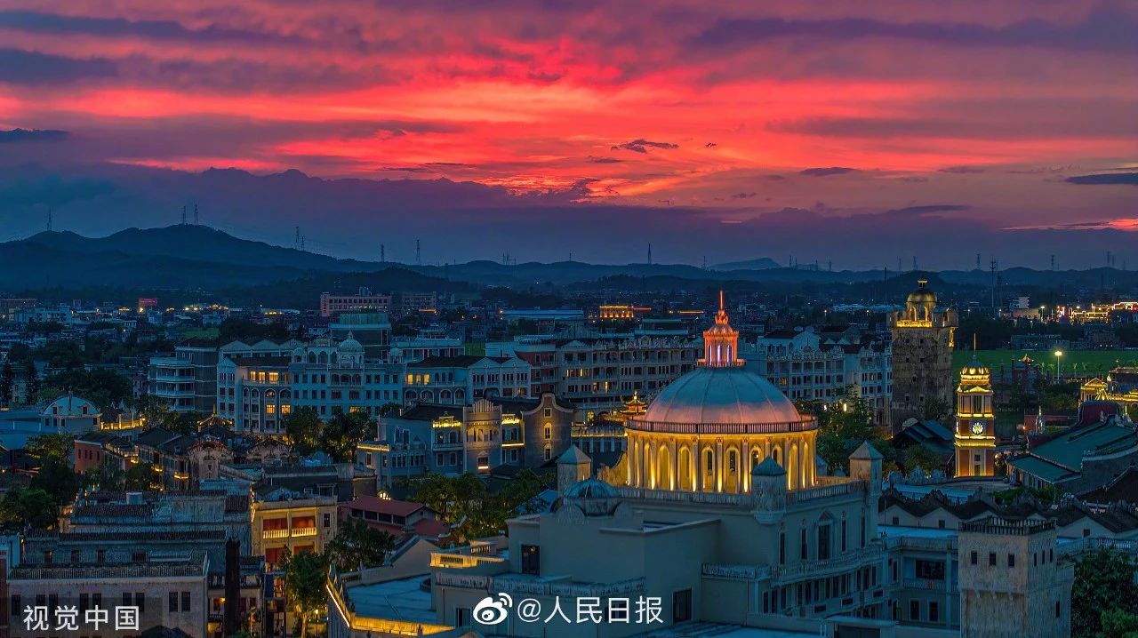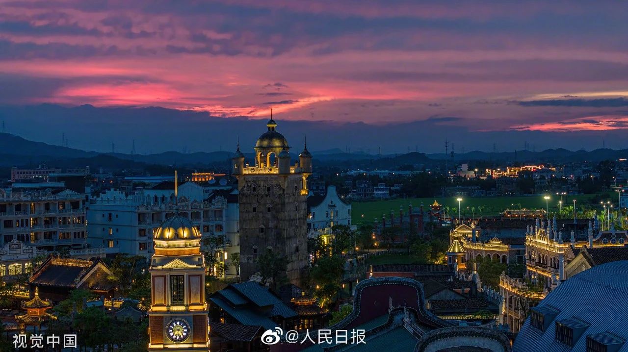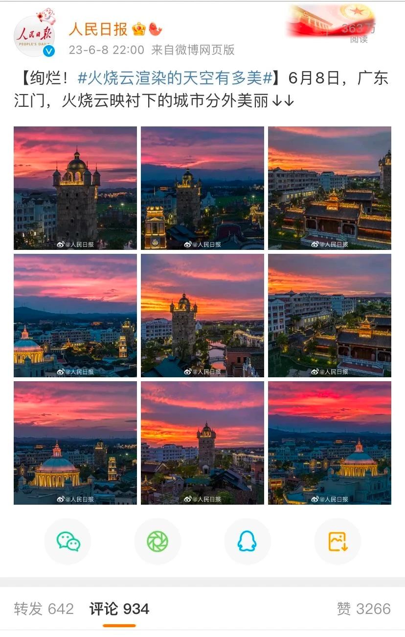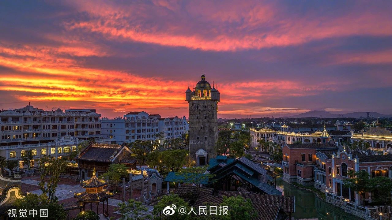 6月8日晚上,人民日?qǐng)?bào)微博登出了開平赤坎華僑古鎮(zhèn)上空的火燒云美景,在火燒云的映襯下,赤坎華僑古鎮(zhèn)顯得格外迷人。