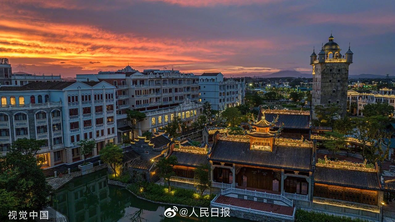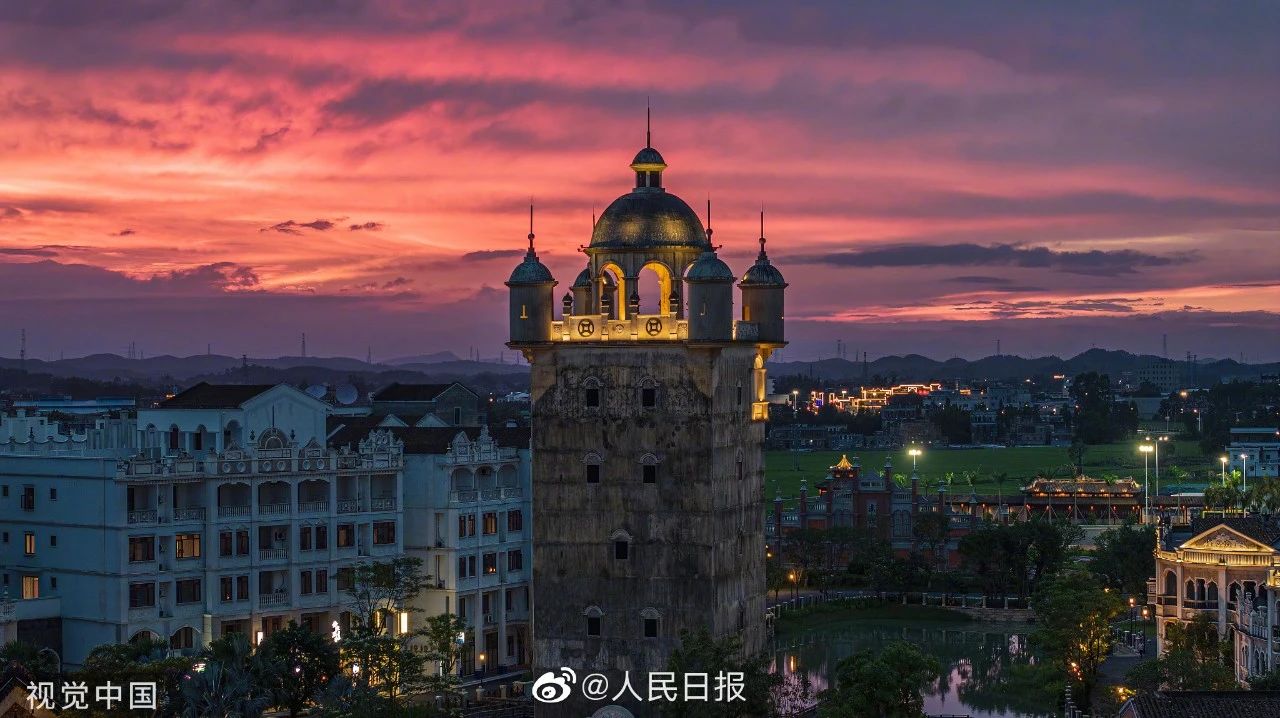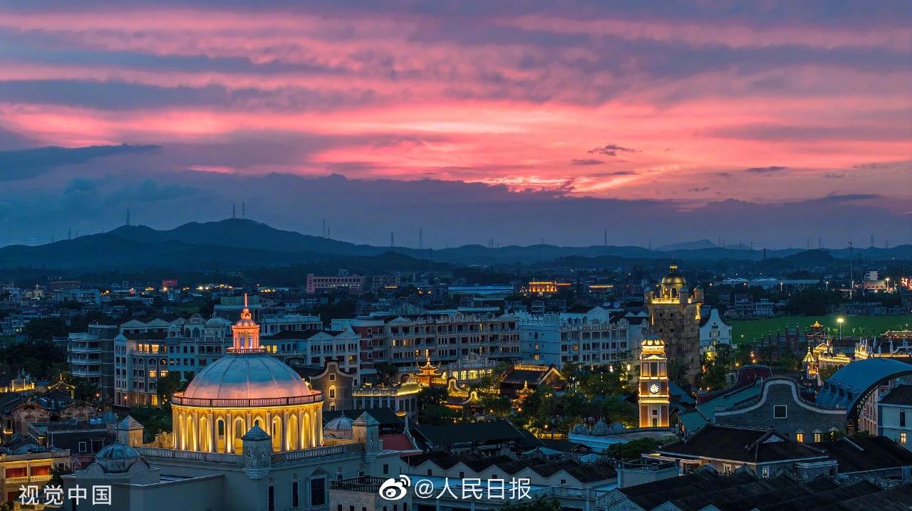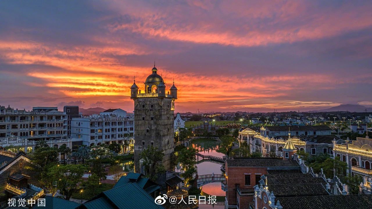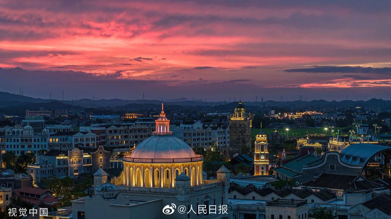 6月8日晚上,人民日?qǐng)?bào)微博登出了開平赤坎華僑古鎮(zhèn)上空的火燒云美景,在火燒云的映襯下,赤坎華僑古鎮(zhèn)顯得格外迷人。