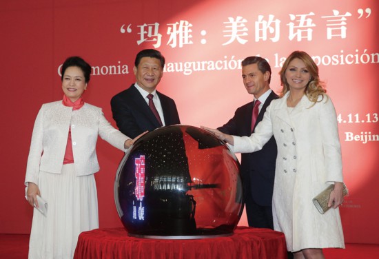 2014年11月13日,國(guó)家主席習(xí)近平同墨西哥總統(tǒng)培尼亞共同出席在國(guó)家博物館舉行的“瑪雅:美的語(yǔ)言”文化展開(kāi)幕式。這是習(xí)近平和夫人彭麗媛與培尼亞夫婦一同為展覽剪彩。 新華社記者 劉衛(wèi)兵/攝