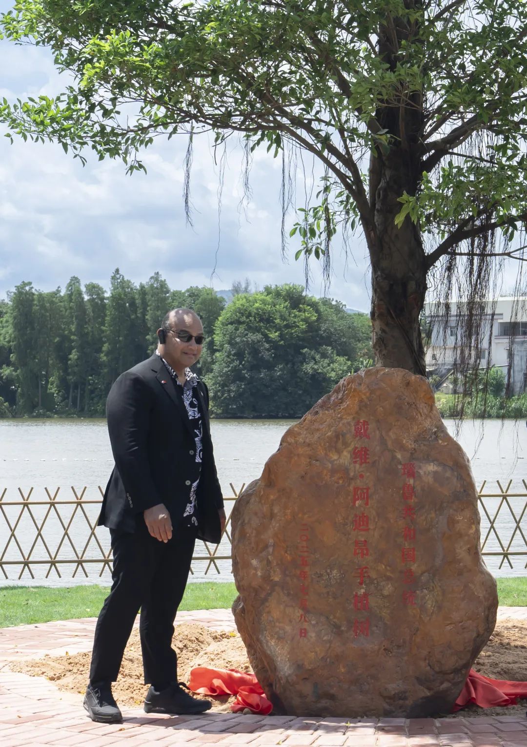 在素庵居廬旁,戴維·阿迪昂和隨行親屬一同揮鍬鏟土、培土澆水,種下一棵象征家族枝繁葉茂、人丁興旺的榕樹。他還收到了一份特殊的禮物——祖祠前的一抔泥土。