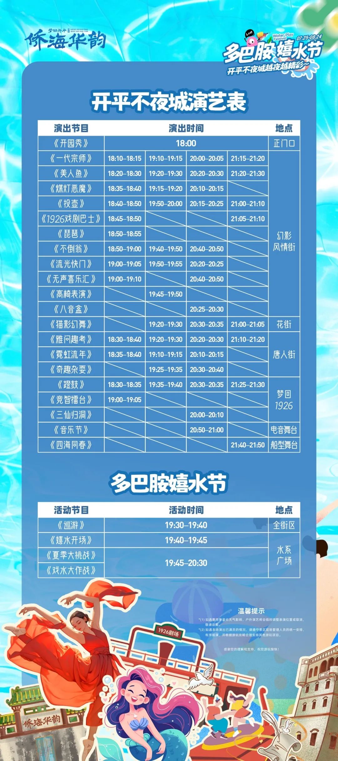 嬉水巡游 發(fā)動(dòng)熱浪反彈的超級(jí)大招 水花瞬間在開平不夜城的每一寸快樂空間炸開 三伏天?全部都彈走! 戲水大作戰(zhàn) 甩開酷熱三伏天 “通緝40 ℃”的熱浪大戰(zhàn)一觸即發(fā)?。?! 靈活穿梭在五彩的水槍射線中 一秒擊走全身熱量 泡沫奇遇 裝載了滿滿的多巴胺 終于可以放下大人的包袱,跌進(jìn)反重力泡泡云 泡泡炸開瞬間,童真的小旋風(fēng)鋪面而來(lái) 電音狂歡 燈光和音響已就緒 一起來(lái)鎖定舞臺(tái)、統(tǒng)治舞池! 隨著節(jié)奏搖擺 迎接音浪風(fēng)暴吧~ 開園秀 喚醒快樂的色彩,引爆快樂因子! 酣暢淋漓的歡迎舞率先拉滿你的情緒 熱情四射,歡樂得讓人尖叫~ 胖胖美人魚 今夏的開平不夜城論誰(shuí)最搶眼? 當(dāng)然是白白胖胖又逗趣的網(wǎng)紅美人魚了~ 來(lái)個(gè)氣泡比心,再來(lái)個(gè)隔空飛吻 可愛滿分! 八音盒 真人版八音盒故事上演 你猜是魔術(shù)師操縱著洋娃娃 還是洋娃娃控制了魔術(shù)師? 夜幕中,引你進(jìn)入神秘世界…… 音樂節(jié) 超強(qiáng)勁音浪和心臟共振 “砰砰”心跳聲是自帶的混響 多巴胺直線飆升,尖叫才是唯一的解藥! 四海同春 重頭戲絕不能錯(cuò)過(guò)~ 磅礴宏偉的大船之上 正上演一場(chǎng)赤坎的百年古埠傳奇 磅礴如虹,向你述說(shuō)歲月的故事 50+中外精彩好戲連臺(tái) 誰(shuí)說(shuō)現(xiàn)實(shí)沒有時(shí)光機(jī)? 王牌演繹,50+中外好戲不容錯(cuò)過(guò) 《1926戲劇巴士》《一代宗師》《不倒翁》 《投壺》《霓虹流年》…… 游走在不同的主題風(fēng)情街道 讓您完全融入每一個(gè)精彩年代 10+項(xiàng)游樂設(shè)施放肆開玩 碰碰車、飛椅、海盜船、無(wú)軌小火車 還有玻璃高臺(tái)滑行的高臺(tái)滑水道! 10+款趣味機(jī)動(dòng)游戲,讓心跳加速 把酷暑遠(yuǎn)遠(yuǎn)甩掉~ 玩累了?直接奔進(jìn)美食天堂! 冰淇淋、暴打檸檬茶、冰爽酸梅湯…… 放肆吃喝無(wú)壓力 開平不夜城·開心大舞臺(tái)新玩法上線! 愛表演愛舞臺(tái)的你,請(qǐng)速速來(lái)報(bào)名! 全場(chǎng)尖叫聲只為你! 這個(gè)夏天,來(lái)開平不夜城 趕走三伏天,一起走花路吧! ?? 演藝表 ?? 不夜城精彩節(jié)目,看這張演藝表就夠了! Q1:園區(qū)營(yíng)業(yè)時(shí)間? 工作日:16:00-22:00/周末:11:00-23:00 Q2:入園是否免費(fèi)? 是的,免票入場(chǎng),演藝活動(dòng)任意看,游樂設(shè)施按具體項(xiàng)目收費(fèi)。 Q3:景區(qū)位置及停車信息? 導(dǎo)航至:赤坎鎮(zhèn)崇文路33號(hào)夢(mèng)回開平僑海華韻