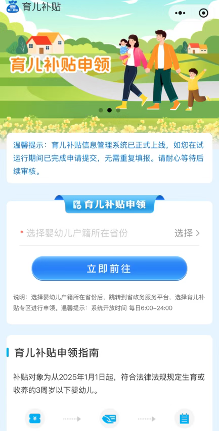 育兒補(bǔ)貼制度從2025年1月1日起實施,補(bǔ)貼對象為符合法律、法規(guī)規(guī)定生育的3周歲以下嬰幼兒,至其年滿3周歲。育兒補(bǔ)貼按年發(fā)放,現(xiàn)階段國家基礎(chǔ)標(biāo)準(zhǔn)為每孩每年3600元。 育兒補(bǔ)貼不分城鄉(xiāng)、民族、區(qū)域,也不分一孩、二孩或者三孩,實現(xiàn)三孩生育政策下家庭支持的全面覆蓋,確保符合條件的嬰幼兒能夠平等享受補(bǔ)貼的待遇。 其中,對2025年1月1日之前出生、不滿3周歲的嬰幼兒,按應(yīng)補(bǔ)貼月數(shù)折算計發(fā)補(bǔ)貼。2022年1月1日以后出生的符合條件的嬰幼兒,都可以領(lǐng)取育兒補(bǔ)貼。 02 育兒補(bǔ)貼申領(lǐng)以家庭為單位,由申領(lǐng)家庭確定1名申領(lǐng)人,應(yīng)當(dāng)是嬰幼兒父母一方,特殊情況下也可以是其他監(jiān)護(hù)人。 育兒補(bǔ)貼發(fā)放渠道為申領(lǐng)人或者嬰幼兒的銀行卡或其他金融賬戶。 育兒補(bǔ)貼信息管理系統(tǒng)和公安、民政、人力資源社會保障等部門建立了信息共享機(jī)制,實現(xiàn)大數(shù)據(jù)比對校核。 申領(lǐng)時只需提交嬰幼兒出生醫(yī)學(xué)證明、戶口簿等證明嬰幼兒身份和撫養(yǎng)關(guān)系的必要材料。 財政部、國家稅務(wù)總局日前發(fā)布公告,對按照育兒補(bǔ)貼制度規(guī)定發(fā)放的育兒補(bǔ)貼免征個人所得稅,自2025年1月1日起施行。 公告稱,衛(wèi)生健康部門與財政部門、稅務(wù)部門建立信息共享機(jī)制??h級衛(wèi)生健康部門按規(guī)定為申領(lǐng)補(bǔ)貼的人員辦理個人所得稅免稅申報。 按照國家統(tǒng)一部署,廣東省育兒補(bǔ)貼申領(lǐng)從2025年9月8日起正式全面開放??赏ㄟ^微信、支付寶或“粵省事”政務(wù)服務(wù)平臺線上申領(lǐng),搜索“育兒補(bǔ)貼”即可找到官方小程序。也可到嬰幼兒戶籍地的鄉(xiāng)鎮(zhèn)政府、街道辦事處現(xiàn)場申領(lǐng)。育兒補(bǔ)貼信息管理系統(tǒng)上線后將全年開放,申領(lǐng)人可在規(guī)定的申領(lǐng)年度內(nèi)任意時間提交申請。 以微信為例,在微信小程序搜索“育兒補(bǔ)貼”,在小程序首頁輸入嬰幼兒戶籍所在省份,點(diǎn)擊“立即前往”,即可跳轉(zhuǎn)至官方政務(wù)服務(wù)平臺,按頁面提示填寫相關(guān)資料并提交申請領(lǐng)取育兒補(bǔ)貼。 近期,不少已經(jīng)申請補(bǔ)貼的 廣東網(wǎng)友表示:已到賬! 還沒申請的寶爸寶媽們 記得抓緊行動起來哦~ 溫馨提示: 大家根據(jù)自身實際情況自主選擇辦理渠道,但無論線上線下,都須認(rèn)準(zhǔn)官方渠道,謹(jǐn)防被騙。