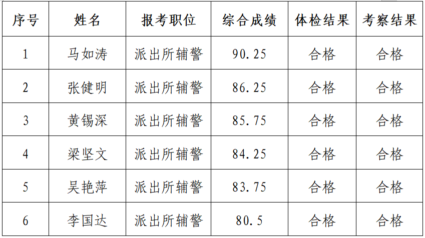 經(jīng)面試、體檢和考察等程序,馬如濤、張健明、黃錫深、梁堅(jiān)文、吳艷萍、李國達(dá)同志符合開平市公安局赤坎派出所公開招聘輔警崗位的資格條件,擬同意聘用,現(xiàn)予以公示。公示期間,如對擬聘用人員名單有異議,請以書面形式向我們反映并注明聯(lián)系方式(無聯(lián)系方式的恕不受理)。