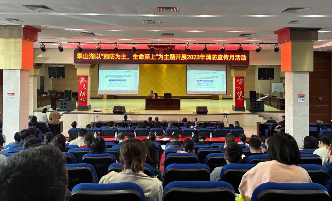 01 召開集中會議 宣傳月期間,翠山湖以“預防為主,生命至上”為主題開展2023年消防宣傳月活動會議,會議向各部門、企業(yè)單位傳達了上級關于消防宣傳月相關工作精神,通報近期省內多起火災事故教訓,部署11月消防宣傳月重點工作。 會議要求,各部門、各企業(yè)單位要以消防宣傳月為契機,扎實開展“119”消防宣傳月系列活動,要廣泛發(fā)動人民群眾參與消防體驗“四個一”活動,各企業(yè)單位要落實好全員教育培訓“三個一”活動,積極宣傳消防安全相關知識,促其牢固樹立消防安全意識,促進轄區(qū)消防安全水平上一個新的臺階。