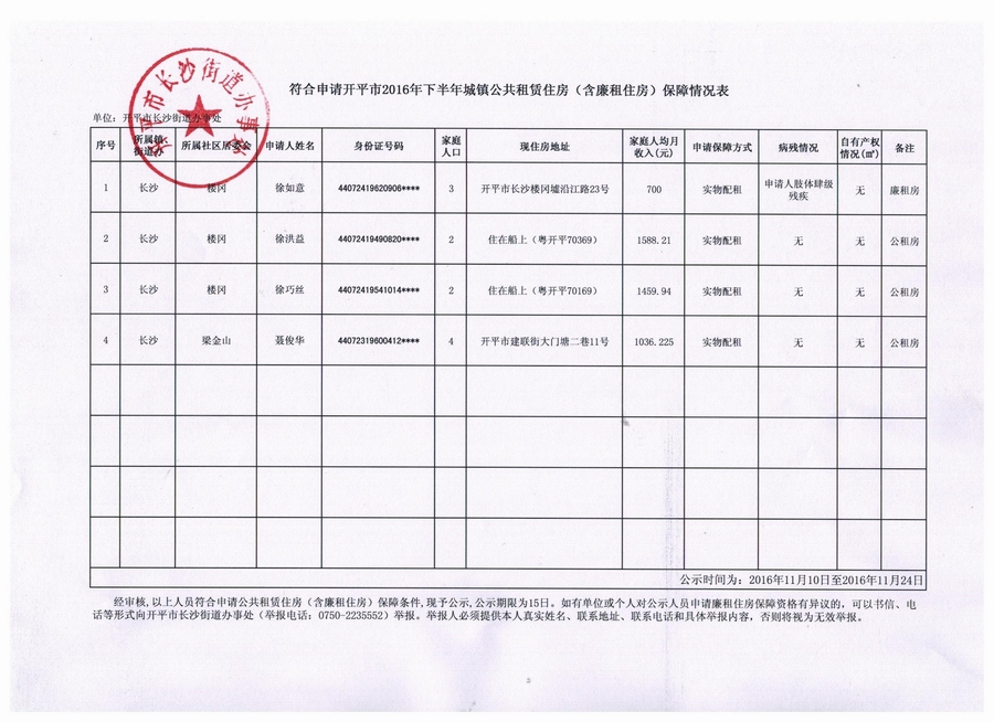 長沙街道符合申請開平市2016年下半年城鎮(zhèn)公共租賃住房(含廉租住房)保障情況表
