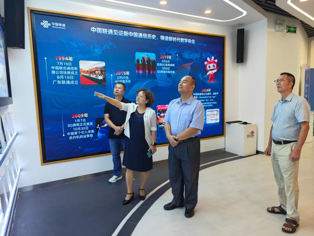 黃大勇一行首先參觀了江門聯(lián)通公司的職工俱樂(lè)部與5G數(shù)字化創(chuàng)新體驗(yàn)中心。在職工俱樂(lè)部,大家實(shí)地感受了企業(yè)的特色文化建設(shè),以及企業(yè)管理中的人文關(guān)懷。在5G數(shù)字化創(chuàng)新體驗(yàn)中心,通過(guò)講解員的細(xì)致介紹和多媒體展示,參觀人員深入了解了中國(guó)聯(lián)通在5G技術(shù)、數(shù)字鄉(xiāng)村、智慧農(nóng)業(yè)等領(lǐng)域的創(chuàng)新成果與實(shí)踐案例。其中,數(shù)字鄉(xiāng)村平臺(tái)在基層治理、便民服務(wù)等方面的應(yīng)用,為赤水鎮(zhèn)鄉(xiāng)村振興及基層治理工作提供了寶貴的借鑒思路,雙方就技術(shù)落地細(xì)節(jié)展開了初步交流。