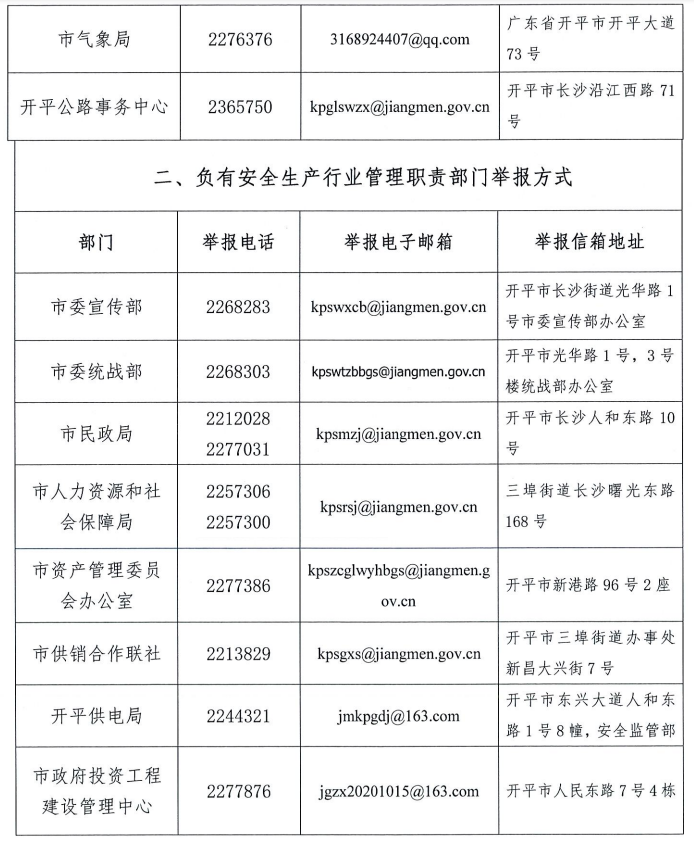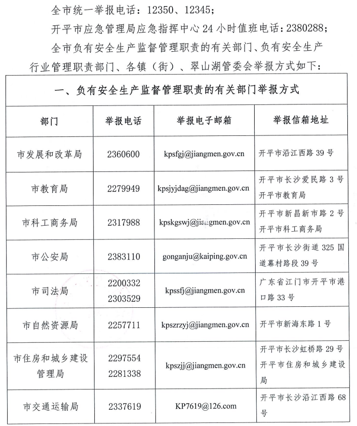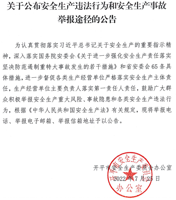 關(guān)于公布安全生產(chǎn)違法行為和安全生產(chǎn)事故舉報途徑的公告