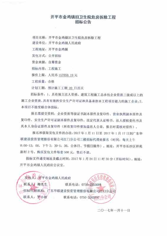 開(kāi)平市金雞鎮(zhèn)舊衛(wèi)生院危房拆除工程招標(biāo)公告