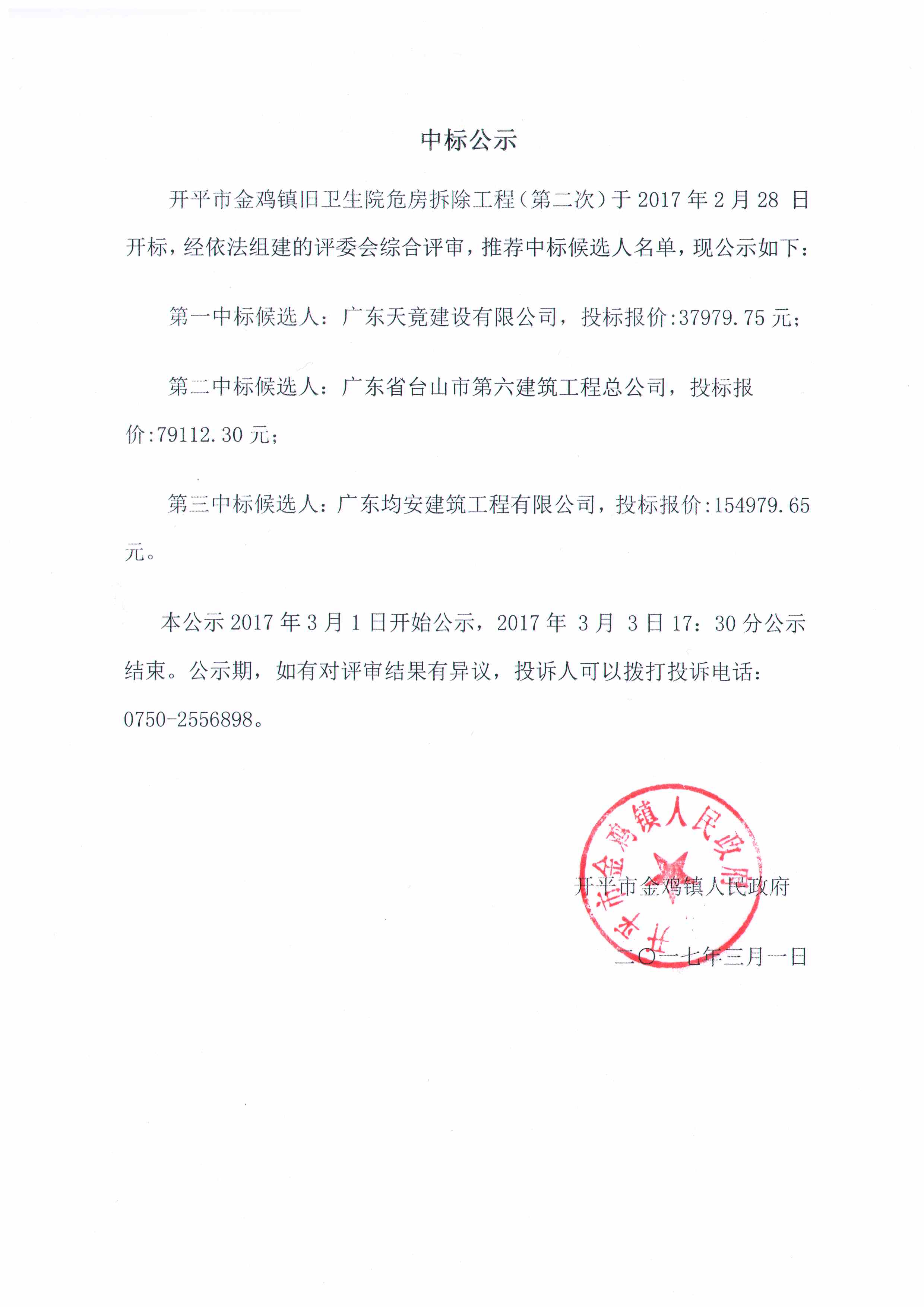 開平市金雞鎮(zhèn)舊衛(wèi)生院危房拆除工程中標(biāo)公示