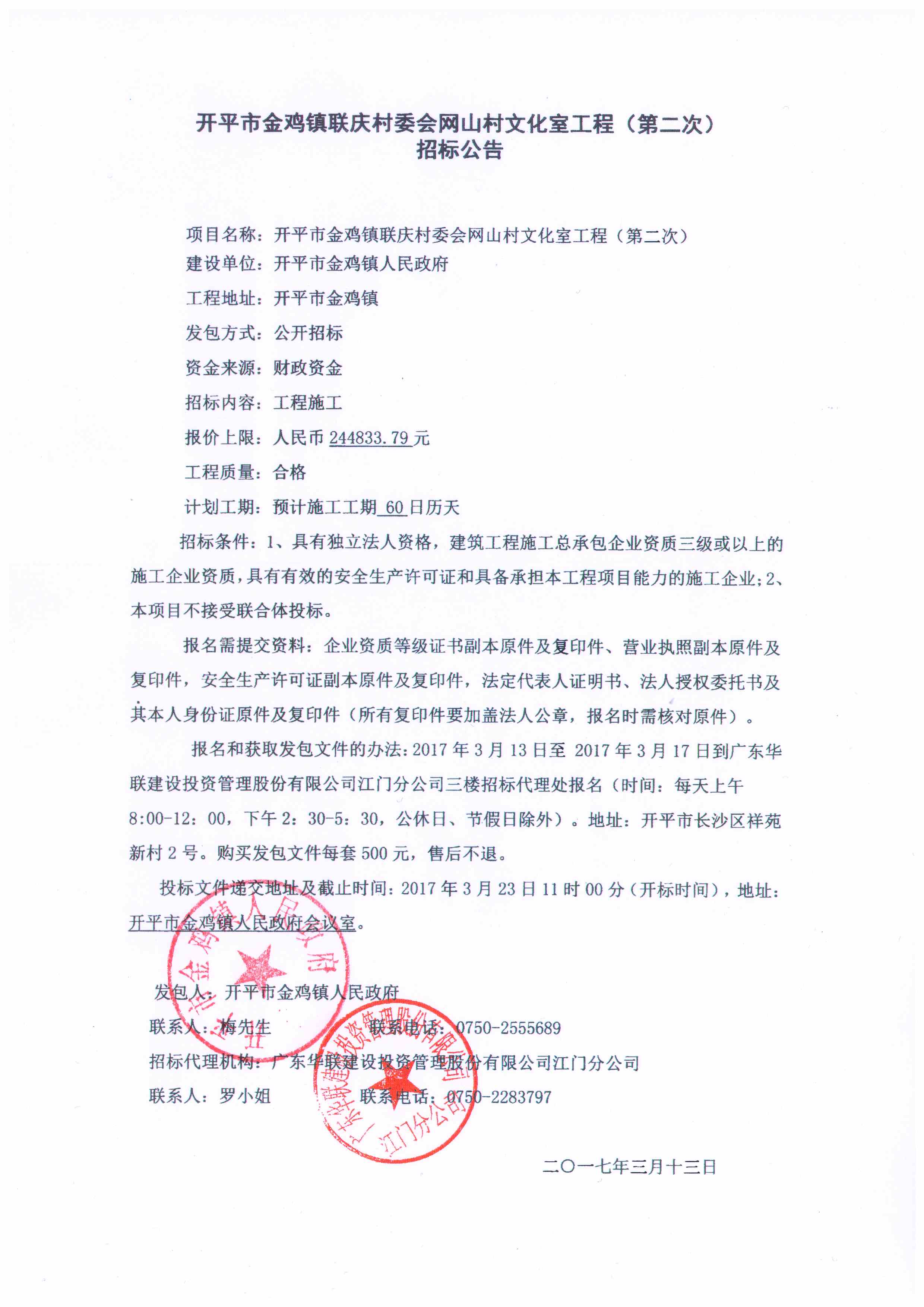開(kāi)平市金雞鎮(zhèn)聯(lián)慶村委會(huì)網(wǎng)山村文化室工程(第二次)