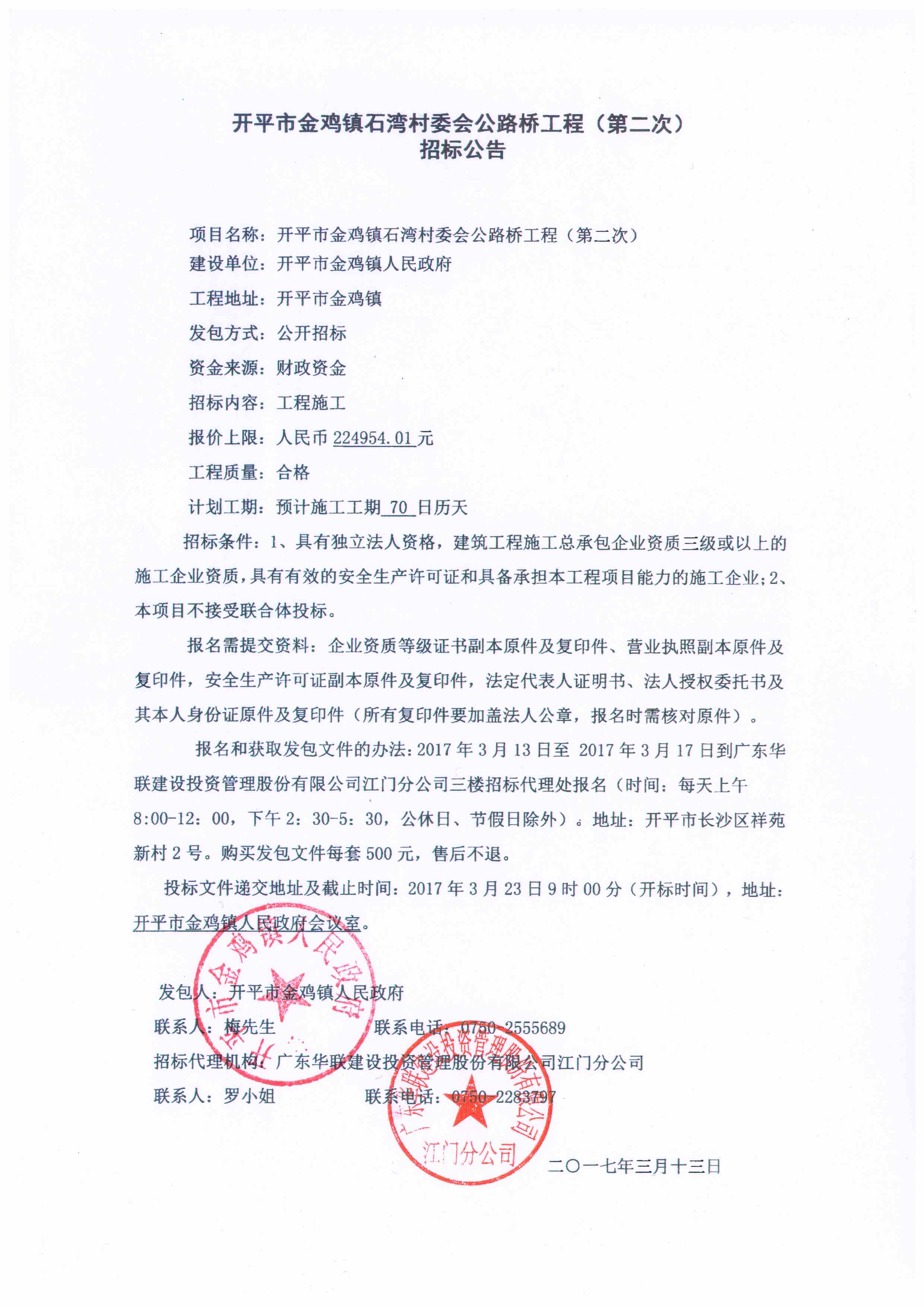 開平市金雞鎮(zhèn)石灣村委會公路橋工程(第二次)