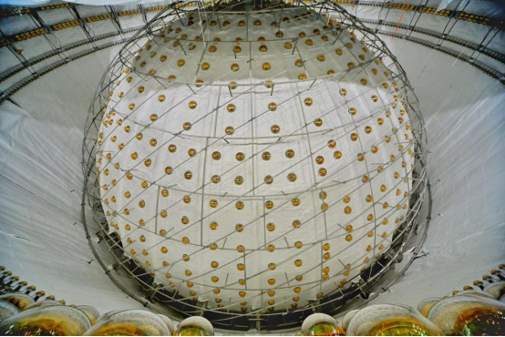 JUNO的核心探測(cè)器為有效質(zhì)量達(dá)2萬噸的液體閃爍體探測(cè)器(中心探測(cè)器),安置于地下實(shí)驗(yàn)大廳44米深的水池中央。直徑41.1米的不銹鋼網(wǎng)殼作為主支撐結(jié)構(gòu),承載了包括35.4米直徑的有機(jī)玻璃球、兩萬噸液體閃爍體、兩萬只20英寸光電倍增管、兩萬五千只3英寸光電倍增管以及前端電子學(xué)、電纜、防磁線圈和隔光板等眾多關(guān)鍵部件。遍布探測(cè)器內(nèi)壁的光電倍增管協(xié)同工作,探測(cè)中微子與液閃相互作用產(chǎn)生的閃爍光,并將其轉(zhuǎn)換為電信號(hào)輸出。