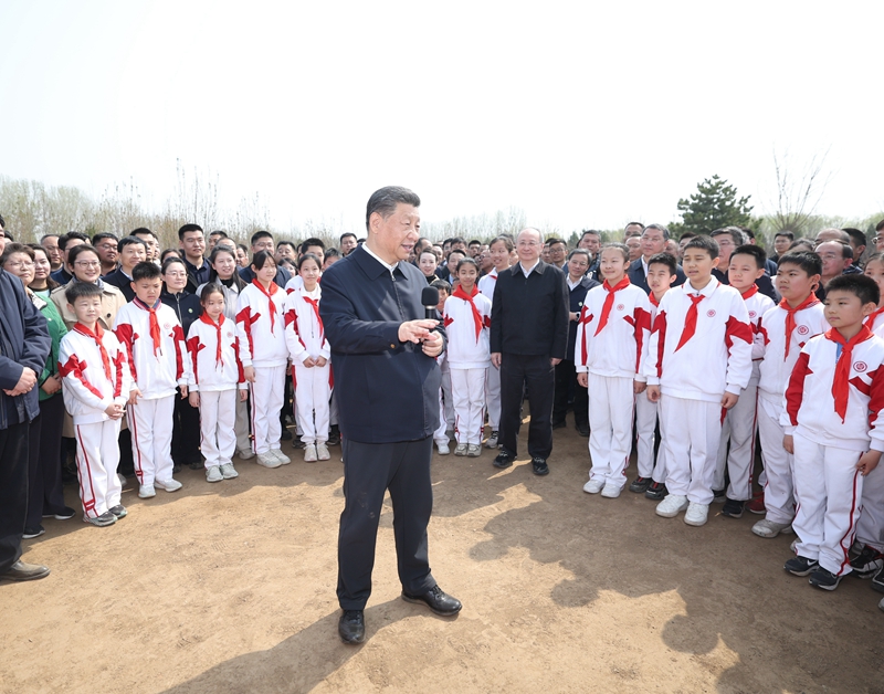 習(xí)近平在參加首都義務(wù)植樹活動時強調(diào) 全民植樹增綠?共建美麗中國 李強趙樂際王滬寧蔡奇丁薛祥李希韓正參加 4月3日,黨和國家領(lǐng)導(dǎo)人習(xí)近平、李強、趙樂際、王滬寧、蔡奇、丁薛祥、李希、韓正等來到北京市通州區(qū)潞城鎮(zhèn)參加首都義務(wù)植樹活動。這是習(xí)近平同大家一起植樹。新華社記者 鞠鵬 攝 4月3日,黨和國家領(lǐng)導(dǎo)人習(xí)近平、李強、趙樂際、王滬寧、蔡奇、丁薛祥、李希、韓正等來到北京市通州區(qū)潞城鎮(zhèn)參加首都義務(wù)植樹活動。這是習(xí)近平同少先隊員在一起。新華社記者 李學(xué)仁 攝 新華社北京4月3日電?中共中央總書記、國家主席、中央軍委主席習(xí)近平3日上午在參加首都義務(wù)植樹活動時強調(diào),清明前后,神州大地處處生機盎然,正是植樹的好時節(jié)。今天我們一起種樹,就是要號召大家都行動起來,積極參與植樹造林,人人爭當(dāng)綠色使者、生態(tài)先鋒,為建設(shè)美麗中國增綠添彩,共同譜寫人與自然和諧共生的中國式現(xiàn)代化新篇章。 京郊大地,春意正濃。上午10時40分許,黨和國家領(lǐng)導(dǎo)人習(xí)近平、李強、趙樂際、王滬寧、蔡奇、丁薛祥、李希、韓正等集體乘車,來到北京市通州區(qū)潞城鎮(zhèn),同首都群眾一起參加義務(wù)植樹。 4月3日,黨和國家領(lǐng)導(dǎo)人習(xí)近平、李強、趙樂際、王滬寧、蔡奇、丁薛祥、李希、韓正等來到北京市通州區(qū)潞城鎮(zhèn)參加首都義務(wù)植樹活動。這是習(xí)近平扛起鐵鍬走向植樹地點。新華社記者 龐興雷 攝 植樹點地處北京市通州區(qū)與河北省廊坊市北三縣交界地區(qū),位于潮白河畔京冀首個跨界共建的森林公園內(nèi),具有良好的濱水生態(tài)條件。 看到總書記來了,正在植樹的干部群眾熱情地向總書記問好。習(xí)近平向大家揮手致意,扛起鐵鍬走向植樹地點,同北京市、國家林業(yè)和草原局負責(zé)同志以及首都干部群眾、少先隊員一起忙碌起來。 4月3日,黨和國家領(lǐng)導(dǎo)人習(xí)近平、李強、趙樂際、王滬寧、蔡奇、丁薛祥、李希、韓正等來到北京市通州區(qū)潞城鎮(zhèn)參加首都義務(wù)植樹活動。這是習(xí)近平同大家一起植樹。新華社記者 鞠鵬 攝 4月3日,黨和國家領(lǐng)導(dǎo)人習(xí)近平、李強、趙樂際、王滬寧、蔡奇、丁薛祥、李希、韓正等來到北京市通州區(qū)潞城鎮(zhèn)參加首都義務(wù)植樹活動。這是習(xí)近平同少先隊員一起給剛栽下的樹苗澆水。新華社記者 鞠鵬 攝 揮鍬鏟土、培土圍堰、提水澆灌……習(xí)近平接連種下油松、黃櫨、元寶楓、櫻桃、紅葉碧桃、側(cè)柏等多棵樹苗。習(xí)近平一邊植樹,一邊詢問孩子們的學(xué)習(xí)生活、勞動鍛煉情況。他強調(diào),廣大青少年是祖國的未來,從小要積極參加勞動、植樹造林,把綠色的種子種進心里,養(yǎng)成尊重自然、熱愛自然的意識,勤奮學(xué)習(xí)、鍛煉身體、茁壯成長,德智體美勞全面發(fā)展,努力成為國家棟梁。植樹現(xiàn)場一派熱火朝天的勞動景象,領(lǐng)導(dǎo)同志們同大家一起培土澆水,氣氛熱烈。 4月3日,黨和國家領(lǐng)導(dǎo)人習(xí)近平、李強、趙樂際、王滬寧、蔡奇、丁薛祥、李希、韓正等來到北京市通州區(qū)潞城鎮(zhèn)參加首都義務(wù)植樹活動。這是習(xí)近平同參加植樹的干部群眾、少先隊員親切交談。新華社記者 鞠鵬 攝 植樹期間,習(xí)近平同在場的干部群眾親切交談。他說,到中央工作后,他已連續(xù)17年參加首都義務(wù)植樹活動。他指出,今年是新中國植樹節(jié)設(shè)立45周年。全國人民堅持植樹造林,荒山披錦繡,沙漠變綠洲,成就舉世矚目。同時要看到,我國缺林少綠問題仍然突出,森林“寶庫”作用發(fā)揮還不夠充分。增綠就是增優(yōu)勢,植樹就是植未來。要一茬接著一茬種,一代接著一代干,不斷增厚我們的“綠色家底”。 4月3日,黨和國家領(lǐng)導(dǎo)人習(xí)近平、李強、趙樂際、王滬寧、蔡奇、丁薛祥、李希、韓正等來到北京市通州區(qū)潞城鎮(zhèn)參加首都義務(wù)植樹活動。這是習(xí)近平同少先隊員在一起。新華社記者 鞠鵬 攝 習(xí)近平強調(diào),綠化祖國要擴綠、興綠、護綠并舉。擴綠,就是要科學(xué)推進大規(guī)模國土綠化,適地適樹、適時適法,種一棵活一棵、造一片成一片。興綠,就是要注重質(zhì)量效益,拓展綠水青山轉(zhuǎn)化為金山銀山的路徑,推動森林“水庫、錢庫、糧庫、碳庫”更好聯(lián)動,實現(xiàn)生態(tài)效益、經(jīng)濟效益、社會效益相統(tǒng)一。護綠,就是要加強林草資源保護,做好防滅火工作,深入開展重大隱患排查整治,守護好來之不易的綠化成果。三北地區(qū)是國土綠化的主戰(zhàn)場,要把更多力量集中到“三北”工程建設(shè)上來,筑牢北疆綠色長城。 4月3日,黨和國家領(lǐng)導(dǎo)人習(xí)近平、李強、趙樂際、王滬寧、蔡奇、丁薛祥、李希、韓正等來到北京市通州區(qū)潞城鎮(zhèn)參加首都義務(wù)植樹活動。這是習(xí)近平同少先隊員在一起。新華社記者 鞠鵬 攝 習(xí)近平指出,綠化祖國要人人盡責(zé)。要暢通群眾參與渠道、創(chuàng)新盡責(zé)形式,發(fā)揮好林長制作用,把各方面力量調(diào)動起來,推動全民義務(wù)植樹不斷走深走實。 在京中