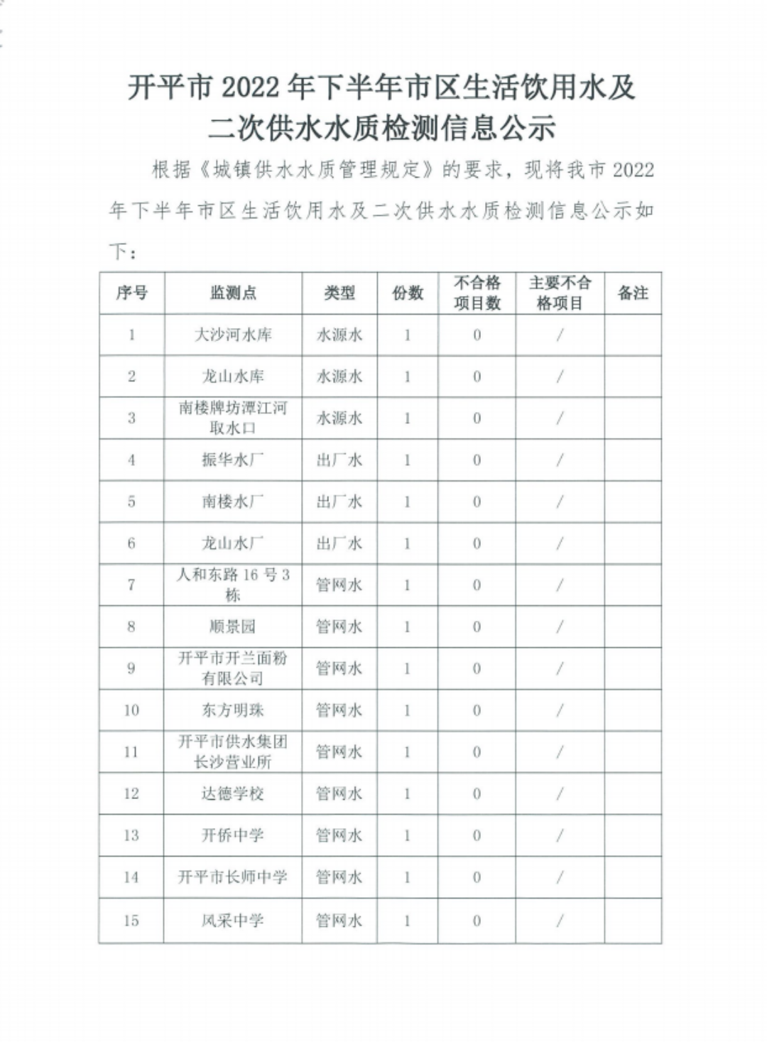開平市2022年下半年市區(qū)生活飲用水及二次供水水質檢測信息公示