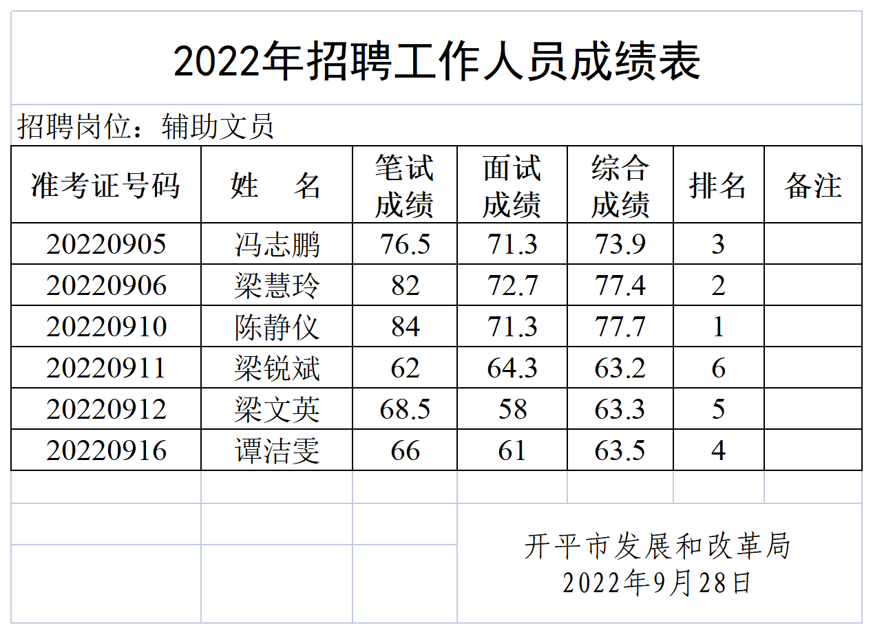 現(xiàn)將開平市發(fā)展和改革局招聘工作人員綜合成績予以公布,綜合成績合格分數(shù)線為60分。