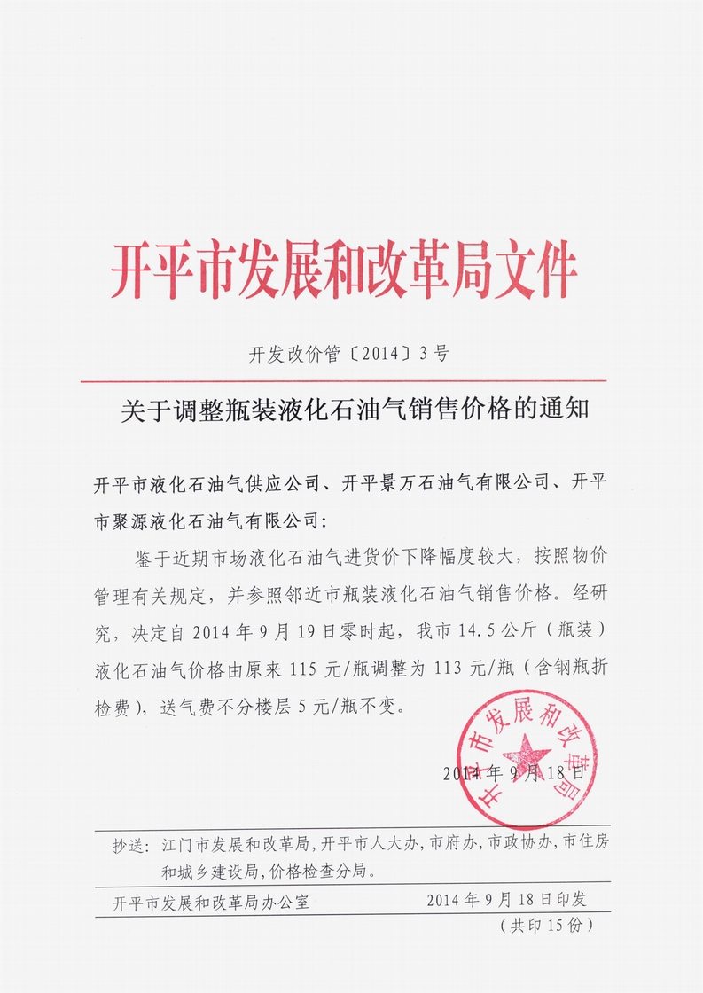 開發(fā)改價管[2014]3號 關(guān)于調(diào)整瓶裝液化石油氣銷售價格的通知