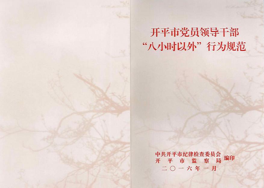 為進(jìn)一步加強(qiáng)黨內(nèi)監(jiān)督,引導(dǎo)黨員領(lǐng)導(dǎo)干部進(jìn)行自我管控,增強(qiáng)“八小時內(nèi)外”自我凈化、自我完善、自我革新、自我提高能力,實(shí)現(xiàn)“廉政建設(shè)明白人,公共管理不瀆職,工作生活無事故”的目標(biāo)。1月29日,開平市在全面鋪開黨員領(lǐng)導(dǎo)干部“八小時以外”活動監(jiān)督試點(diǎn)工作,并向全市各單位發(fā)放《黨員領(lǐng)導(dǎo)干部“八小時以外”行為規(guī)范》,為黨員領(lǐng)導(dǎo)干部行為建立“警戒線”,標(biāo)示“高壓線”,指明“安全區(qū)”。