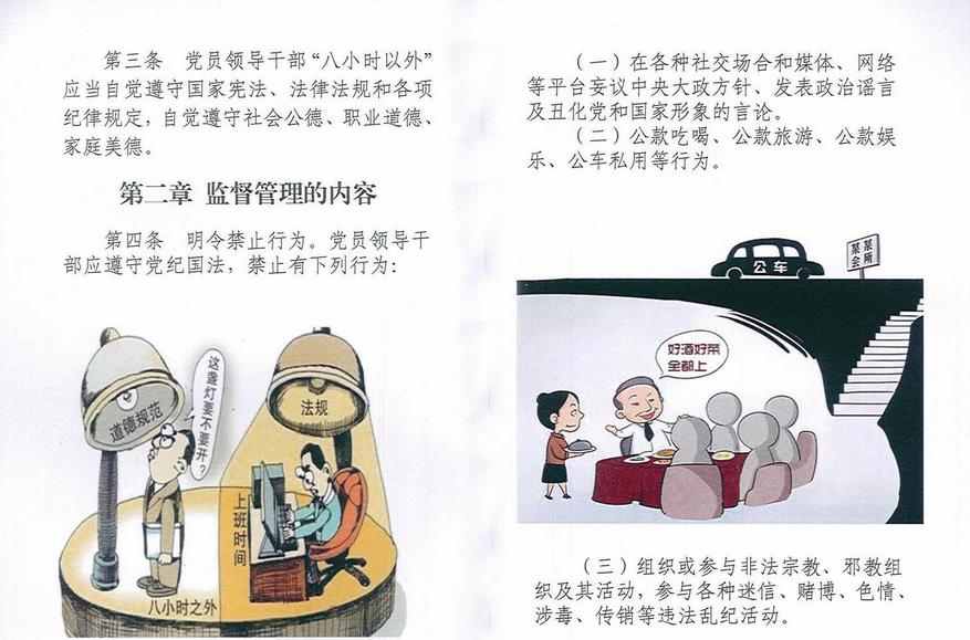 第三條 黨員領(lǐng)導(dǎo)干部“八小時以外”應(yīng)當(dāng)自覺遵守國家憲法、法律法規(guī)和各項(xiàng)紀(jì)律規(guī)定,自覺遵守社會公德、職業(yè)道德、家庭美德.