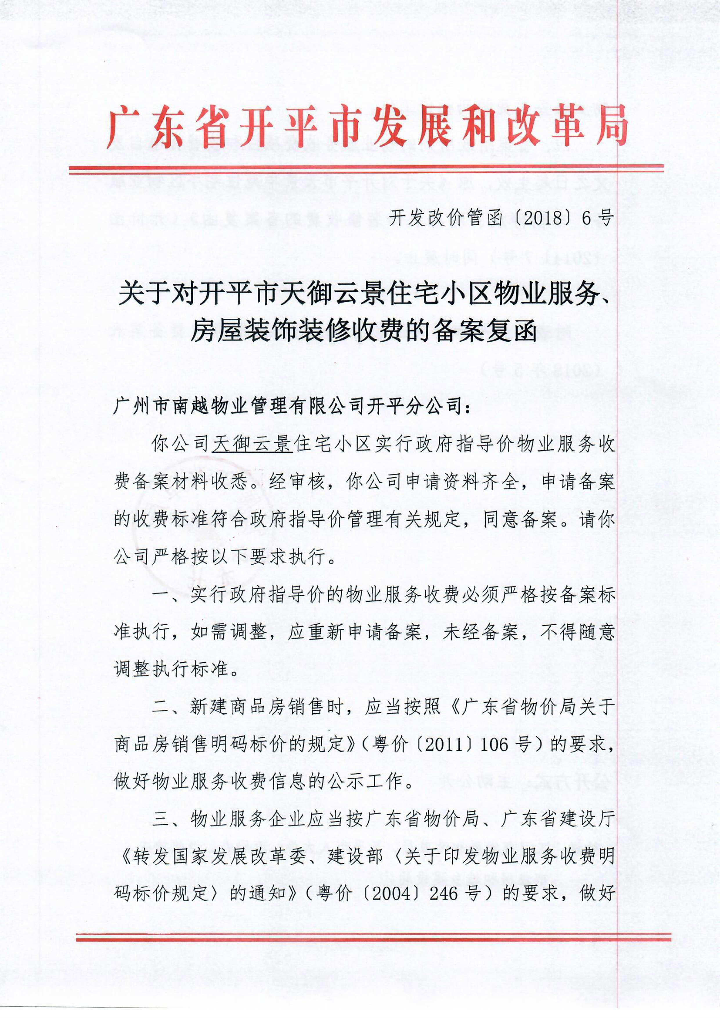 開發(fā)改價(jià)管函〔2018〕6號(hào) 關(guān)于對(duì)開平市天御云景住宅小區(qū)物業(yè)服務(wù)、房屋裝飾裝修收費(fèi)的備案復(fù)函