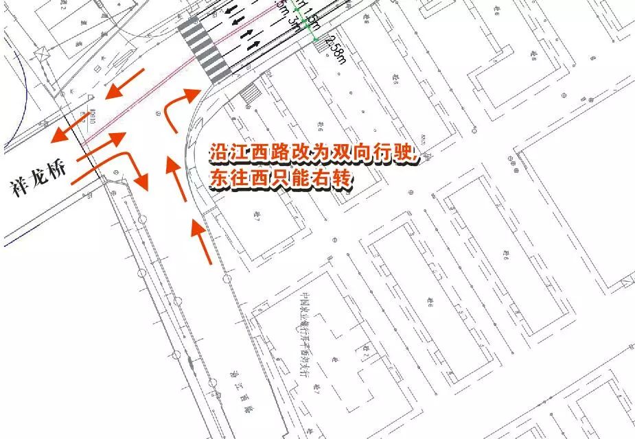 5、沿江西路往祥龍橋上橋路段:改為雙向行駛,東往西只能右轉(zhuǎn)。