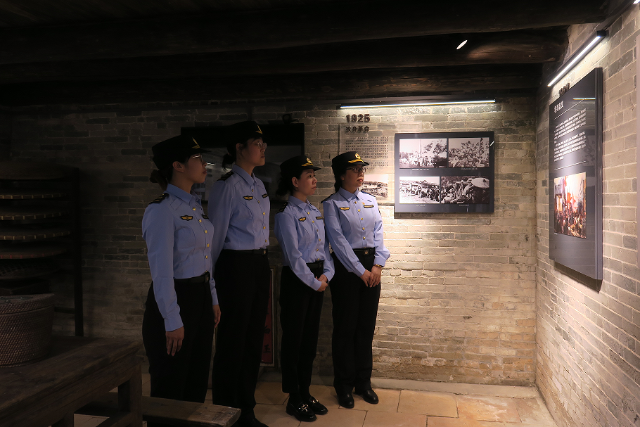 在周文雍故居,全體女子執(zhí)法隊(duì)員參觀了周文雍生前的祖屋,以及屋里其生前使用過(guò)的壁柜、方桌、木箱等,一樣樣舊物件,形象生動(dòng)地再現(xiàn)周文雍的生平,鮮活地呈現(xiàn)熱血的革命歷史。結(jié)合導(dǎo)覽講解,黨員們更進(jìn)一步了解周文雍同志生平事跡,從周文雍同志面對(duì)敵人“頭可斷,肢可折,革命精神不可滅”的大無(wú)畏精神和對(duì)人民群眾鞠躬盡瘁、死而后已的精神力量深刻感悟共產(chǎn)黨人的初心和使命,從中汲取前進(jìn)的力量。