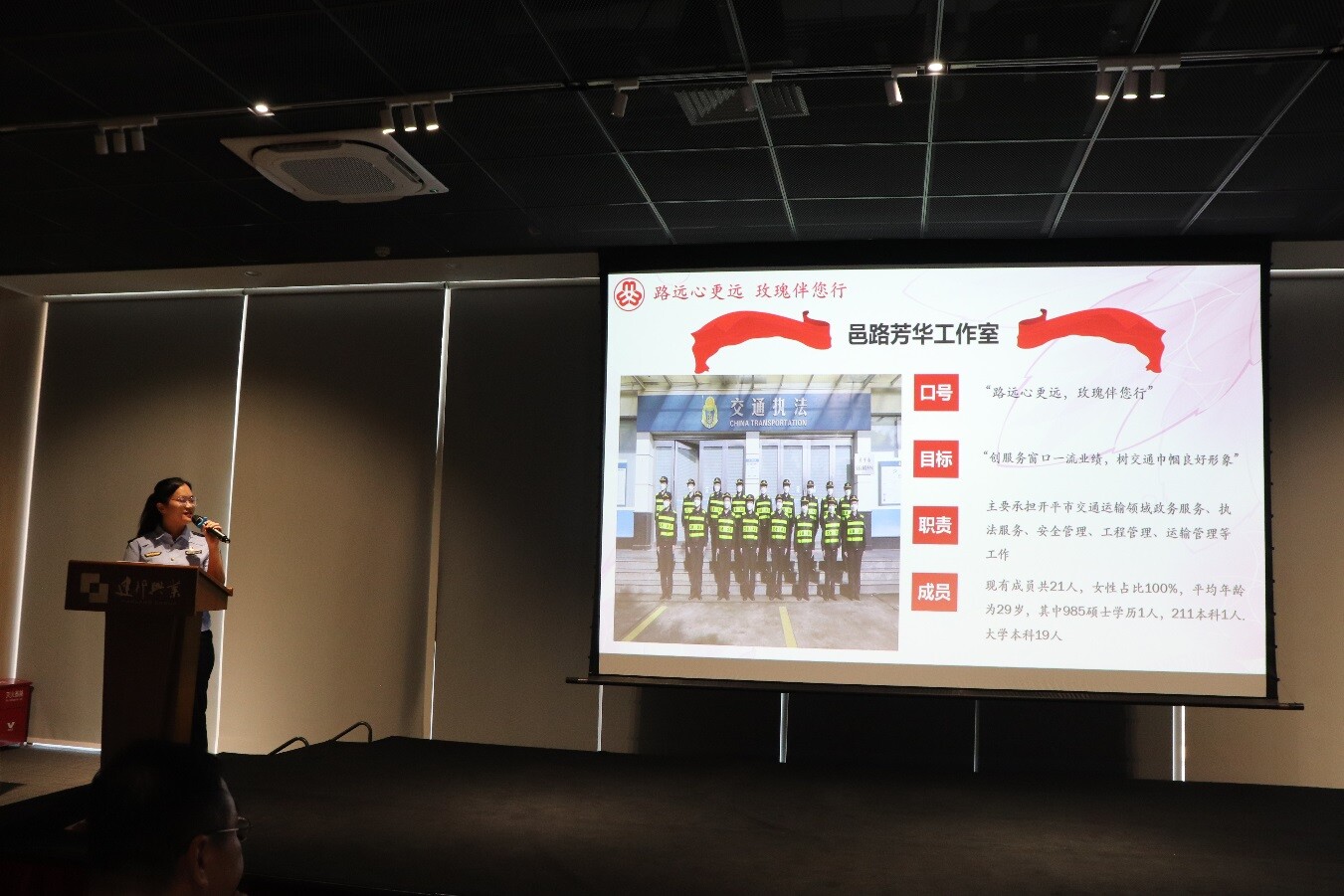 然后,“巾幗文明崗”成員駱妙嬋同志介紹了邑路芳華工作室概況,并詳細介紹了“巾幗文明崗”的創(chuàng)崗背景,講述開平市交通巾幗們立足本職崗位,爭先創(chuàng)優(yōu)等工作中的感人事跡,展現(xiàn)巾幗“交通藍”的奉獻、擔當、創(chuàng)新以及砥礪深耕的新時代女性精神風貌。