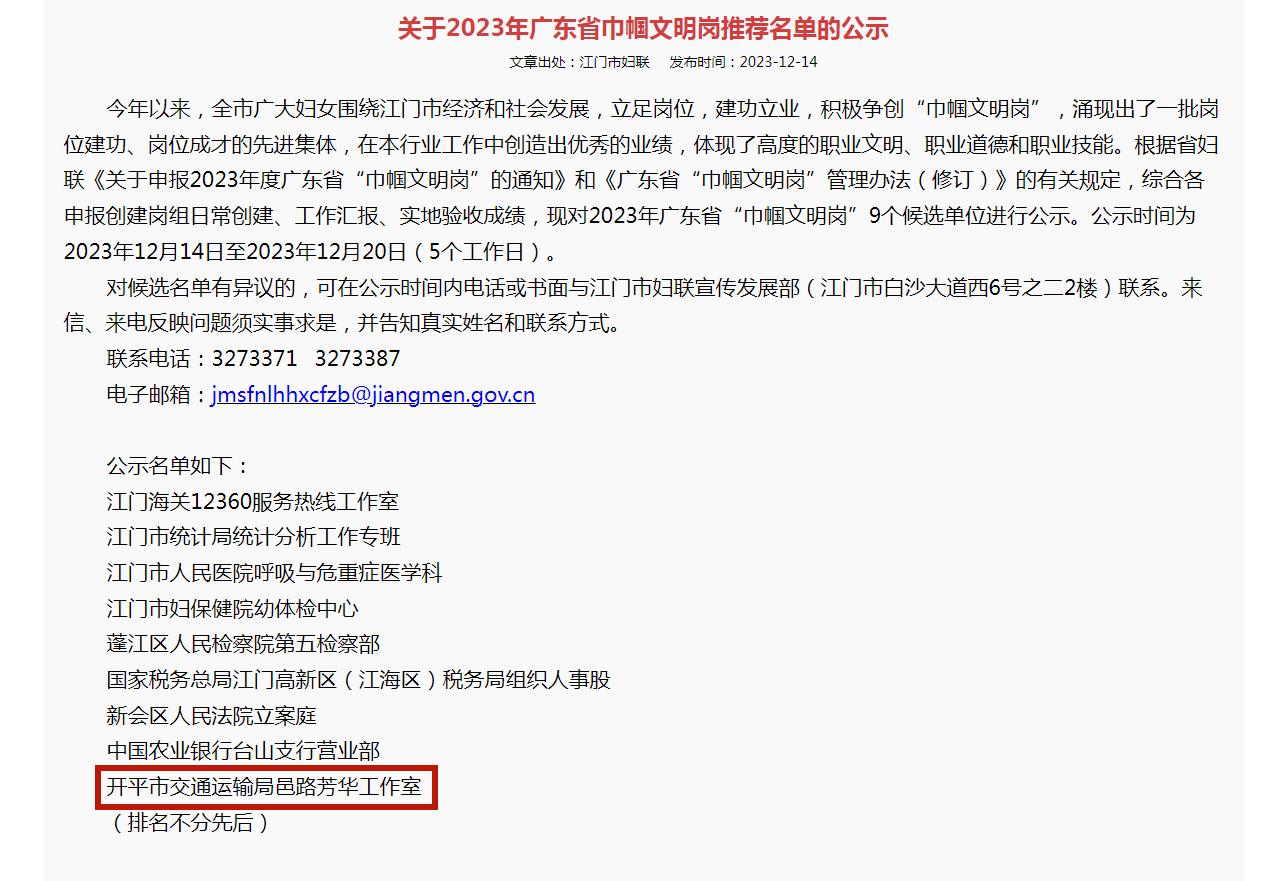 近日,江門市婦聯(lián)發(fā)布《關(guān)于2023年廣東省巾幗文明崗?fù)扑]名單的公示》,開平市交通運(yùn)輸局“邑路芳華”工作室入圍省級(jí)巾幗文明崗?fù)扑]名單,為她們點(diǎn)贊!