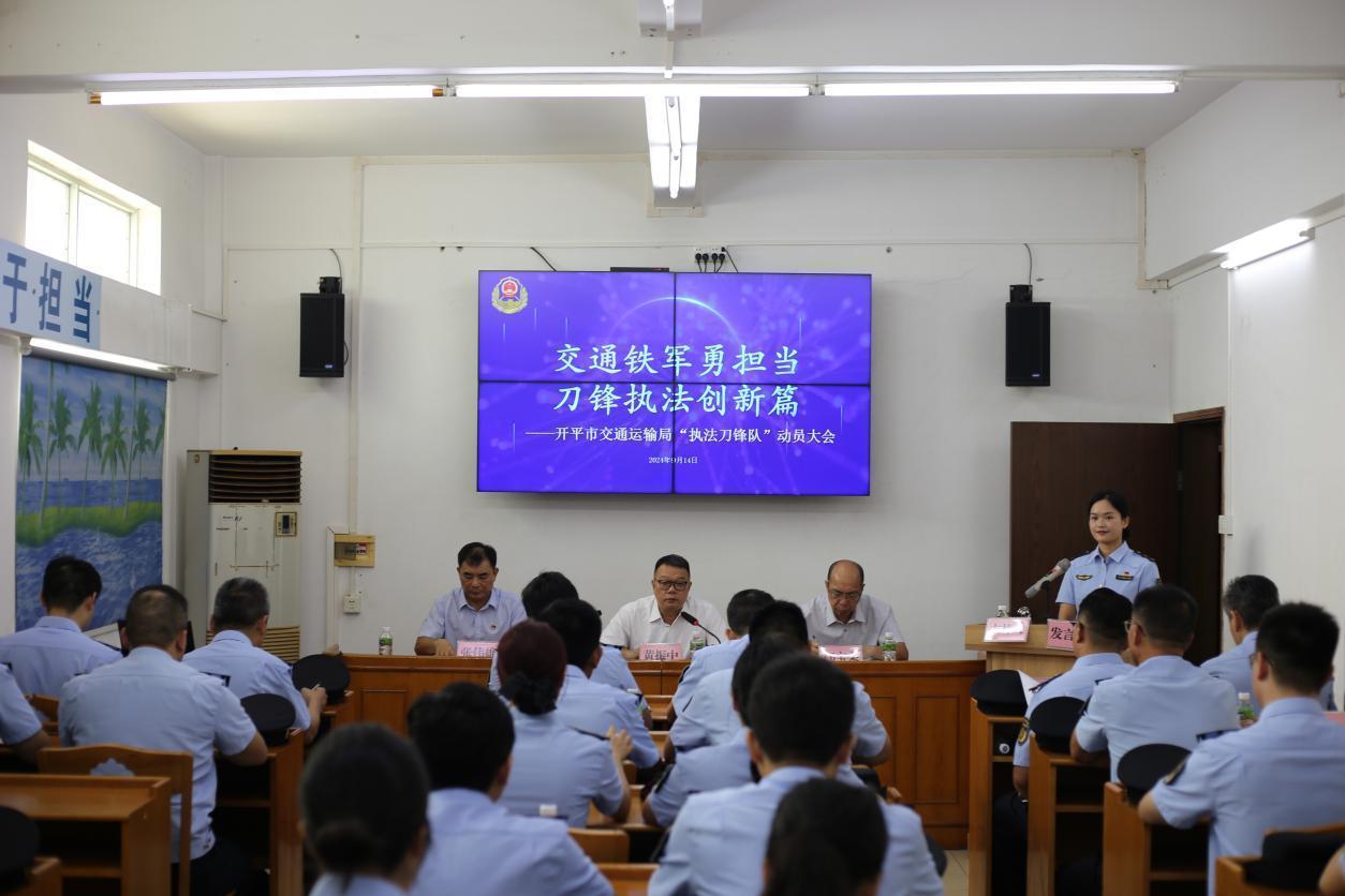 為進(jìn)一步深化“2024交通執(zhí)法規(guī)范年”建設(shè),爭當(dāng)交通執(zhí)法規(guī)范化建設(shè)排頭兵,彰顯交通鐵軍沖鋒在前的擔(dān)當(dāng)作為,9月14日上午,市交通運(yùn)輸局舉行執(zhí)法刀鋒隊動員會及啟動儀式。江門市交通運(yùn)輸局黨組成員、副局長黃振中,開平市人民政府辦公室二級主任科員鄺寶柔,開平市交通運(yùn)輸局黨組書記、局長張偉雄,江門市交通運(yùn)輸局、開平市公安局交通警察大隊以及開平市交通運(yùn)輸局執(zhí)法刀鋒隊全體隊員參加了動員會及啟動儀式。