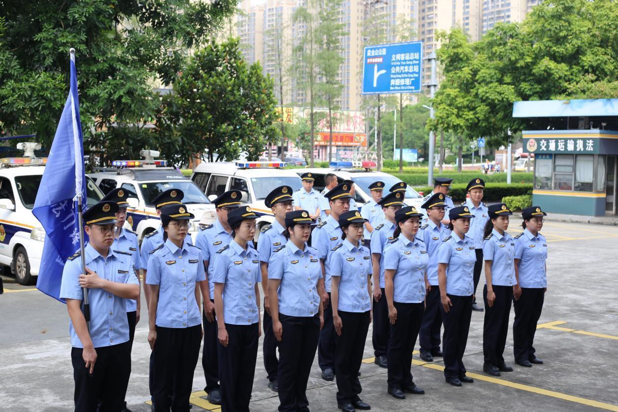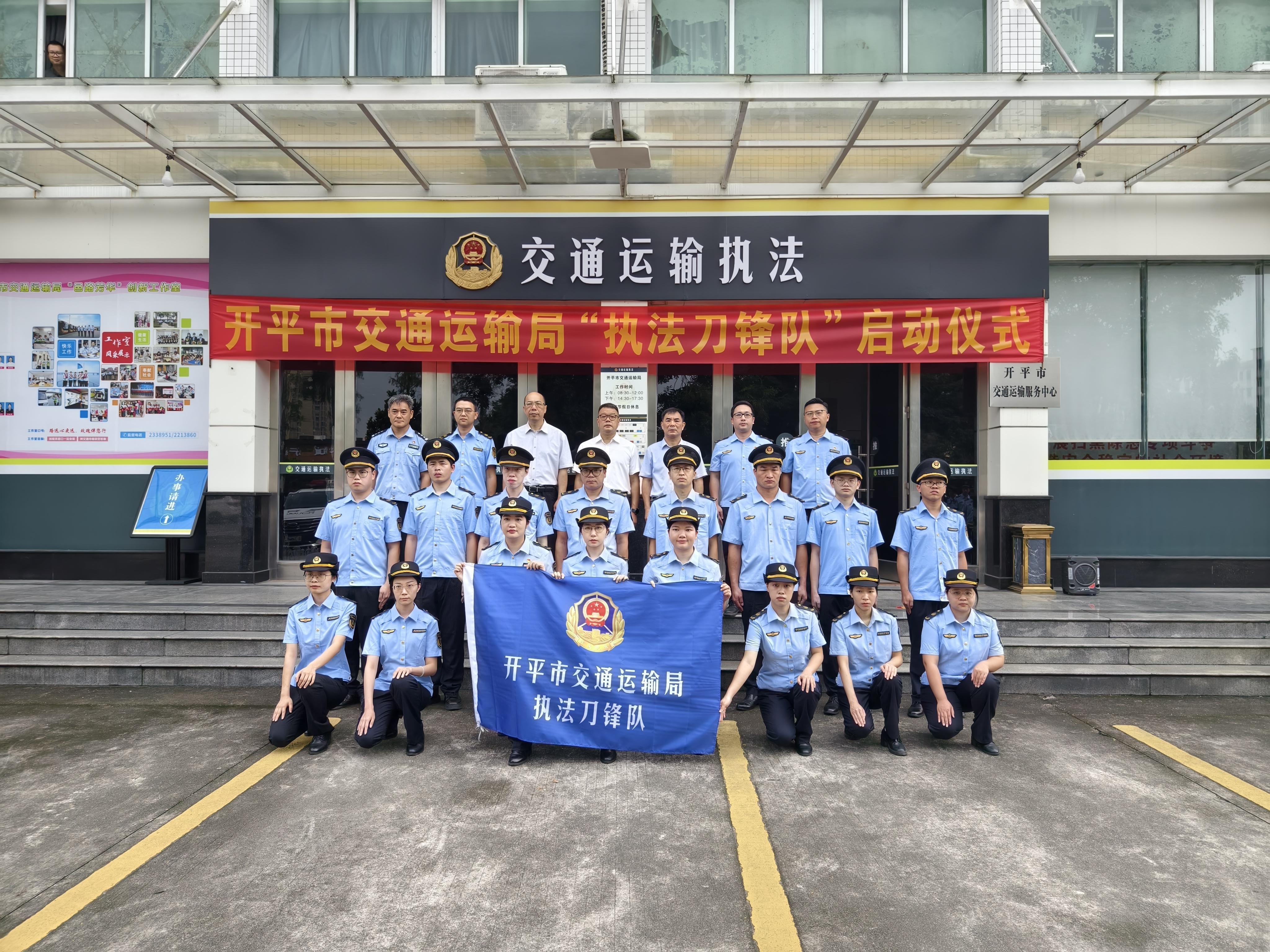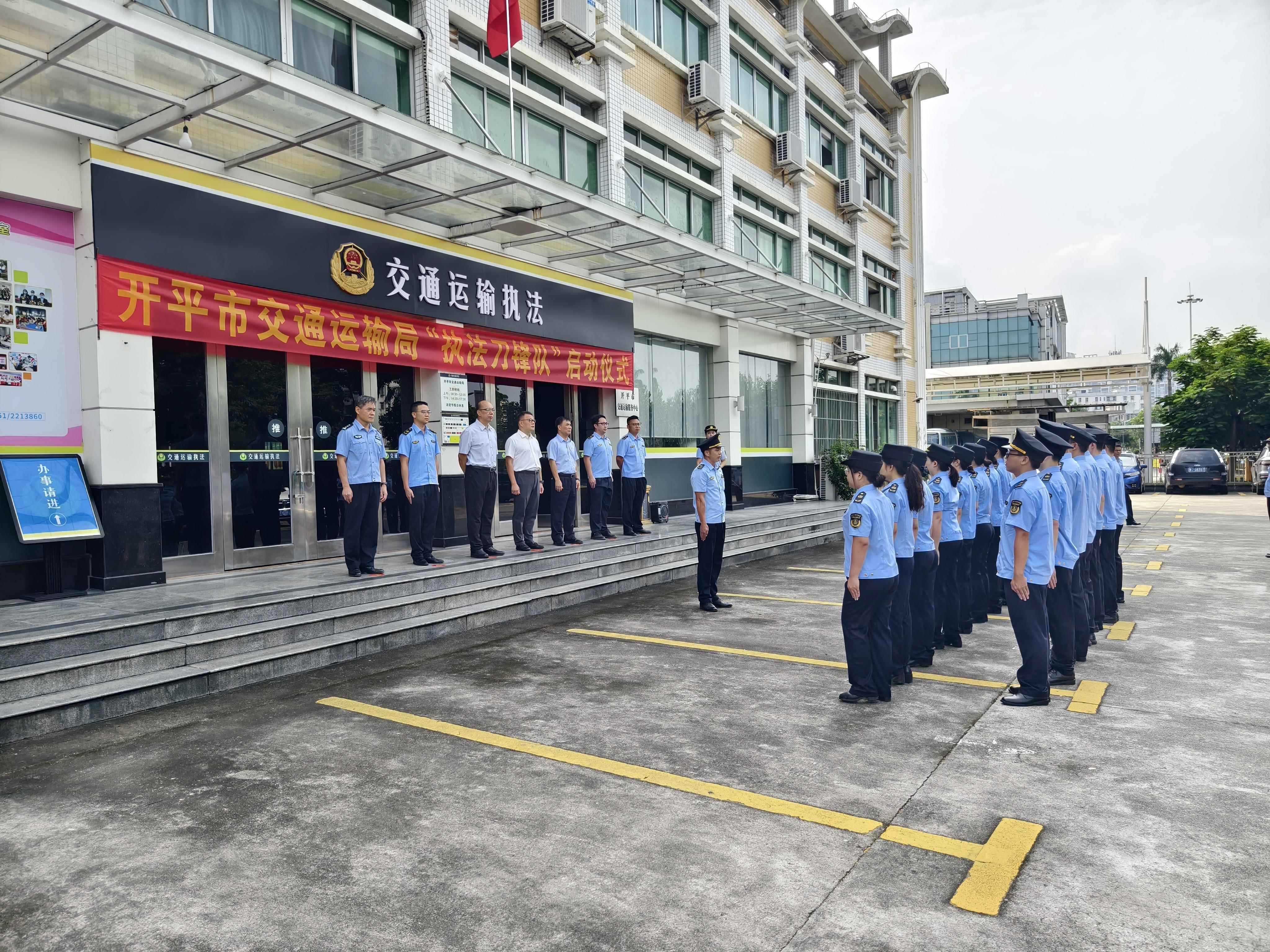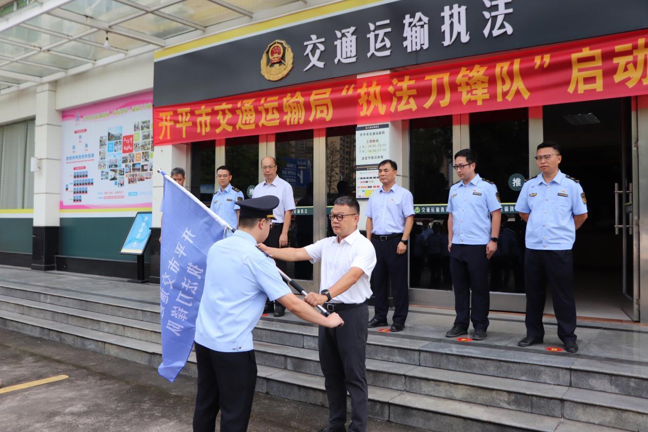 儀式上,江門市交通運(yùn)輸局黨組成員、副局長黃振中宣布開平市交通運(yùn)輸局執(zhí)法刀鋒隊正式成立,并為執(zhí)法刀鋒隊授旗,參會領(lǐng)導(dǎo)共同按響汽笛。伴隨著“交通鐵軍勇?lián)?dāng),刀鋒執(zhí)法創(chuàng)新篇”嘹亮口號,開平市交通運(yùn)輸局執(zhí)法刀鋒隊全面展開執(zhí)法行動。