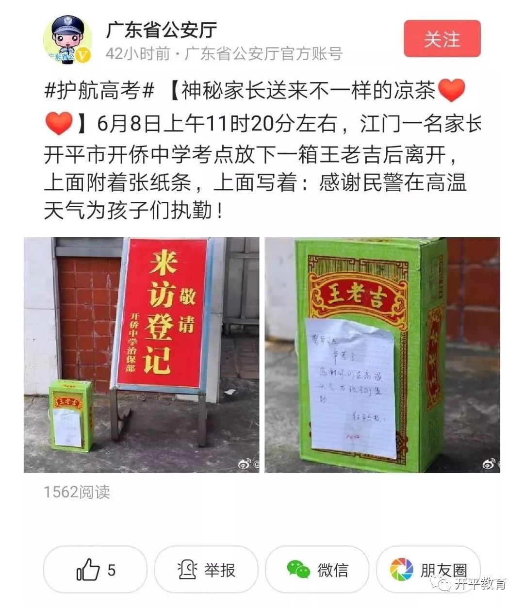 “感動(dòng)高考”。6月8日,開(kāi)僑中學(xué)考點(diǎn)上演感動(dòng)一幕:一家長(zhǎng)送來(lái)一箱涼茶,感謝民警在高溫天氣為孩子們執(zhí)勤。該事件得到廣東省公安廳充分肯定。