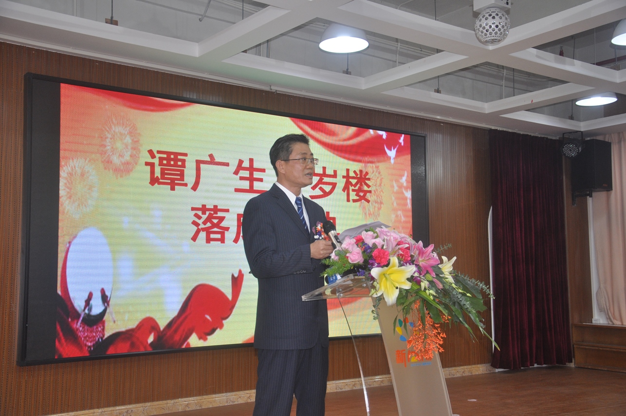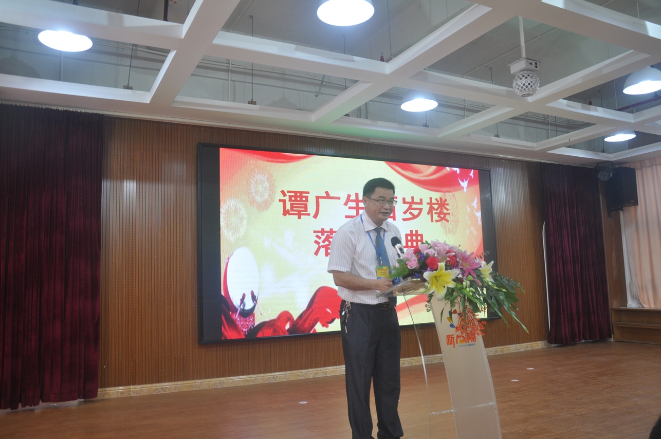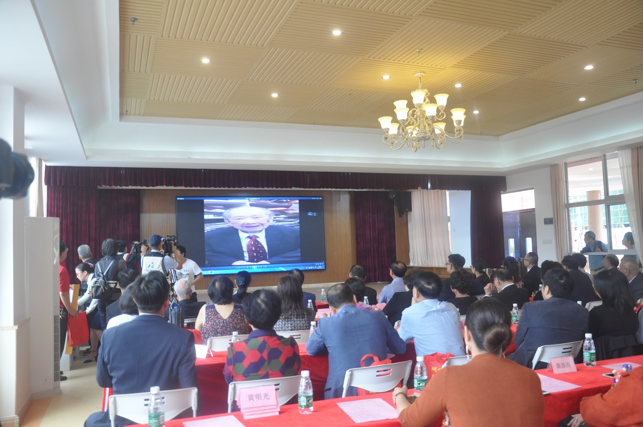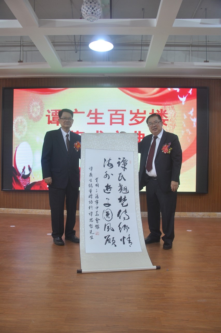譚瑞彰先生代表譚廣生先生致送譚思哲先生贈言——“譚氏翹楚傳鄉(xiāng)情,海外游子圓夙愿。”以此表達(dá)自己對譚思哲先生的感激之情。譚廣生先生還特意在美國錄制了視頻為落成慶典致辭,表達(dá)了這位百歲老人的喜悅之情。開僑中學(xué)老師自編自演散文長詩《中國夢,百歲不老》,表達(dá)了對譚廣生這位百歲老華僑的崇敬之情!