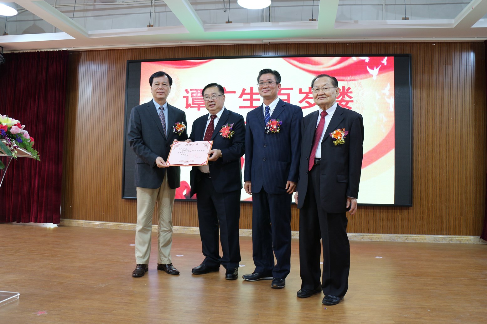 在慶典儀式上,譚遠(yuǎn)寧局長、張文瀾副董事長和關(guān)開宗校長為譚廣生先生頒發(fā)了開僑中學(xué)榮譽校長聘任證書,并由譚廣生先生兒子譚瑞璋先生代領(lǐng)。