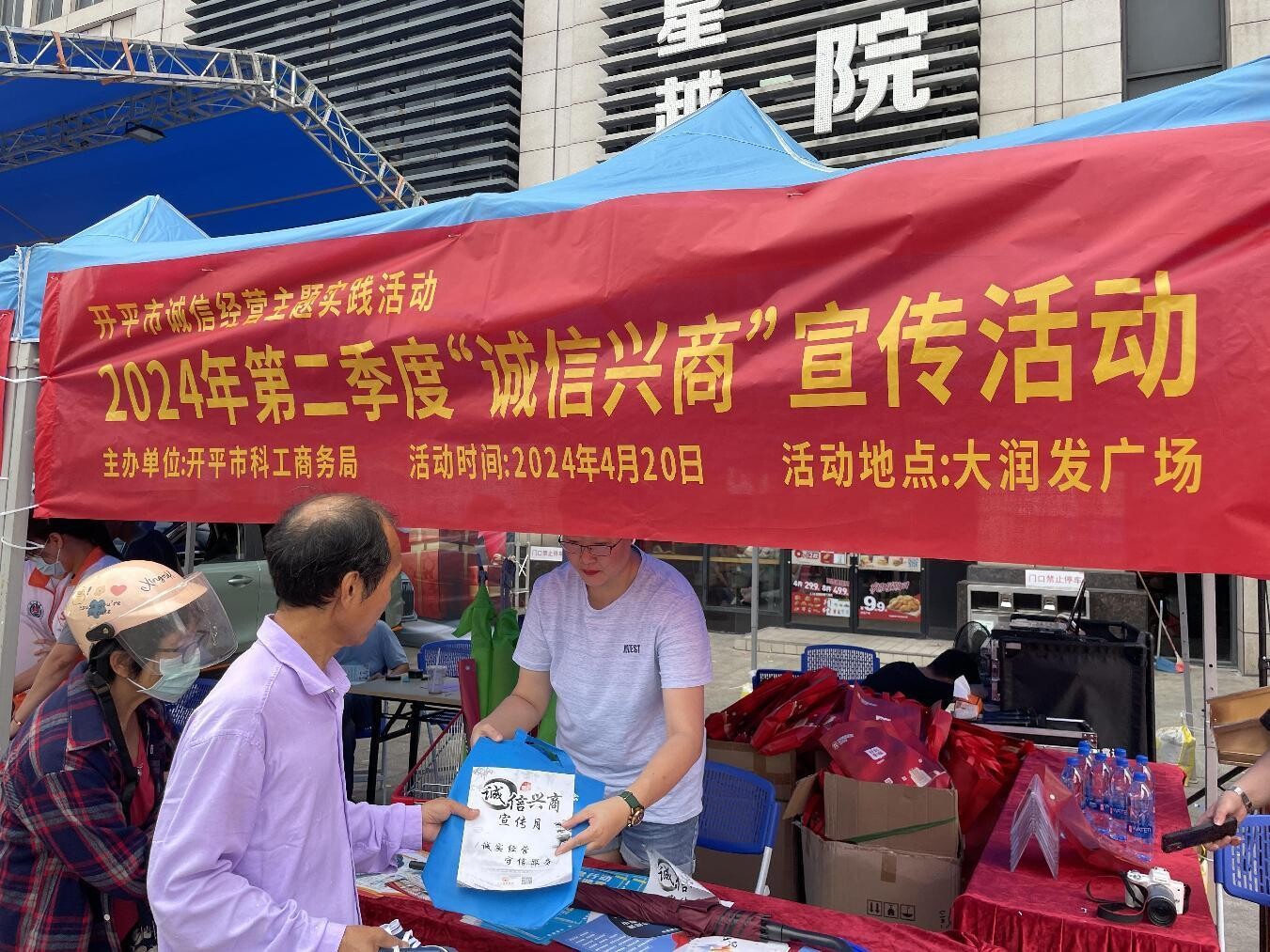 為深入推進(jìn)“誠信興商”宣傳教育工作,營造誠信營商環(huán)境和放心消費(fèi)環(huán)境,4月20日,開平市科工商務(wù)局在大潤發(fā)廣場開展2024年第二季度“誠信興商”宣傳活動(dòng)。