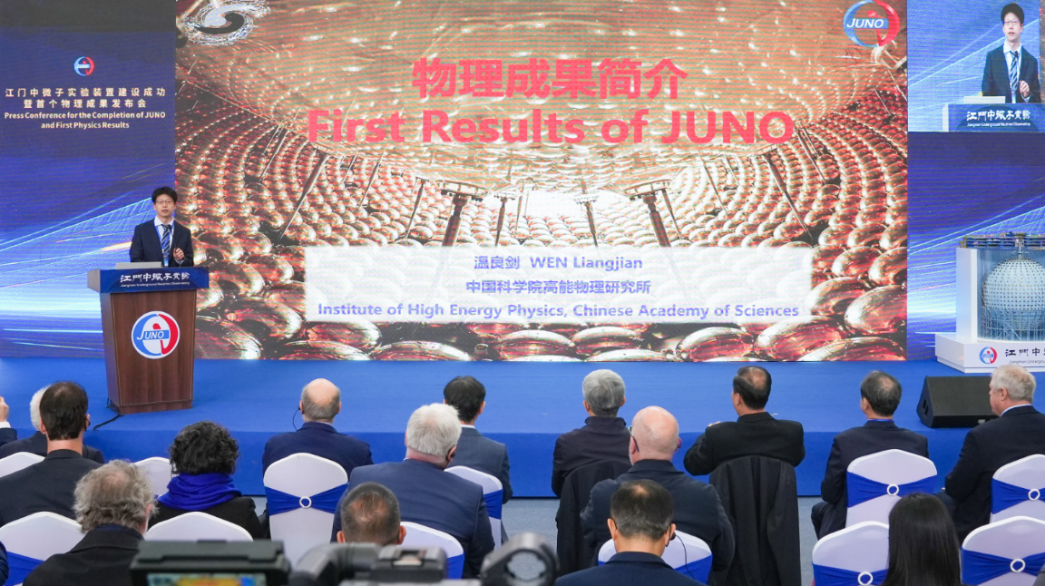 中國(guó)科學(xué)院高能物理研究所副所長(zhǎng)、江門(mén)中微子實(shí)驗(yàn)合作組物理分析負(fù)責(zé)人溫良劍報(bào)告江門(mén)中微子實(shí)驗(yàn)的首個(gè)物理成果。