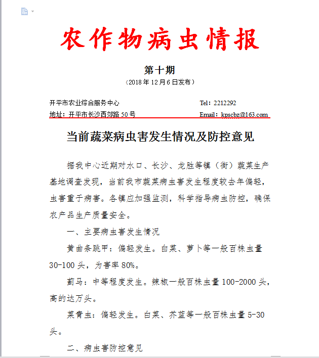 開平市病蟲情報(bào)2018年第10期(蔬菜)