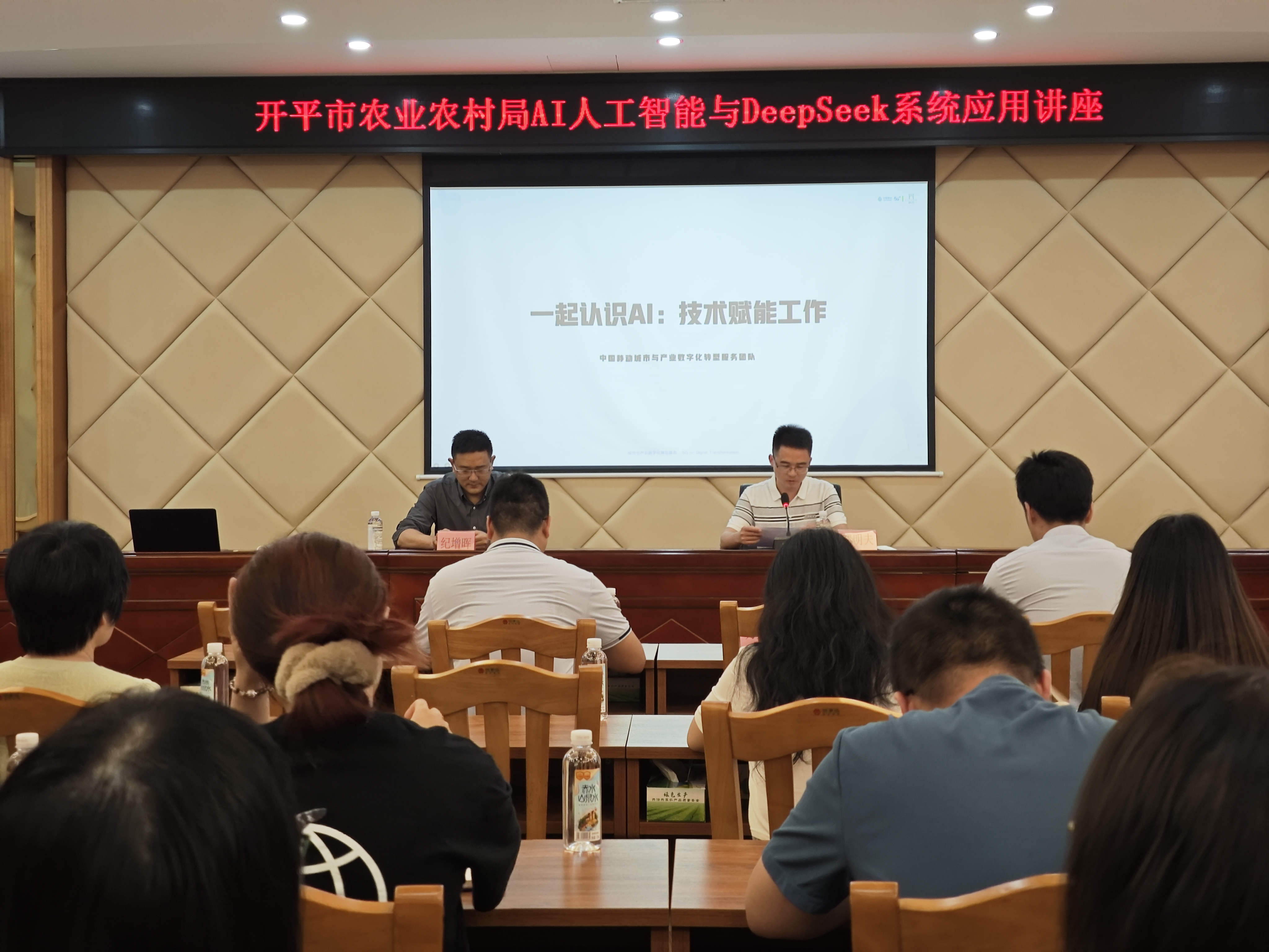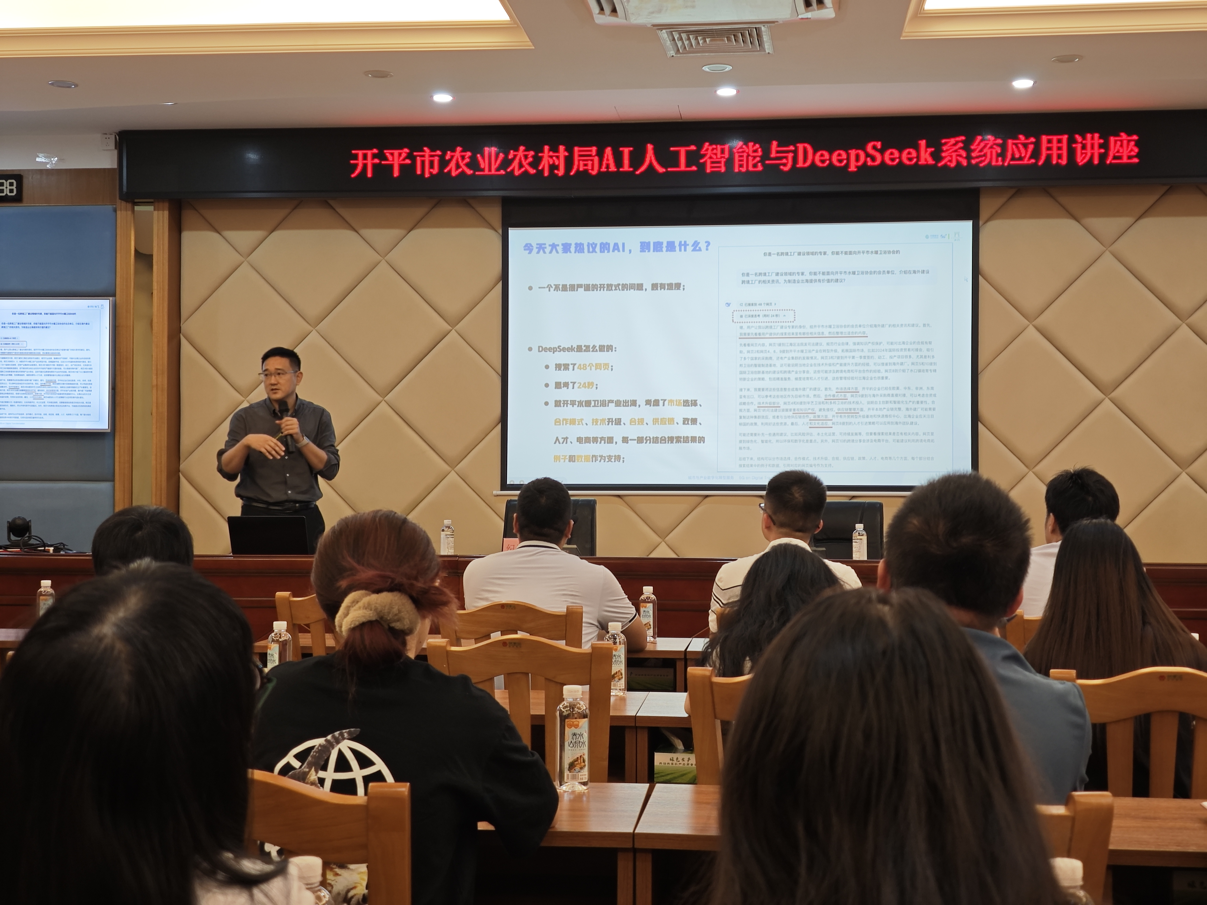2025年4月11日,開(kāi)平市農(nóng)業(yè)農(nóng)村局為深入貫徹落實(shí)中央一號(hào)文件關(guān)于“發(fā)展農(nóng)業(yè)新質(zhì)生產(chǎn)力”的部署要求,推動(dòng)農(nóng)業(yè)數(shù)字化轉(zhuǎn)型,提升政務(wù)與農(nóng)業(yè)工作效率,開(kāi)平市農(nóng)業(yè)農(nóng)村局聯(lián)合中國(guó)移動(dòng)開(kāi)平分公司舉辦《AI人工智能與DeepSeek系統(tǒng)應(yīng)用》專題培訓(xùn)。中國(guó)移動(dòng)開(kāi)平分公司總經(jīng)理、開(kāi)平市“百千萬(wàn)工程”專家智庫(kù)成員紀(jì)增暉受邀授課,市農(nóng)業(yè)農(nóng)村局局系統(tǒng)全體干部參加學(xué)習(xí)。 培訓(xùn)會(huì)上,紀(jì)增暉總經(jīng)理結(jié)合國(guó)家級(jí)“5G+智慧園區(qū)”建設(shè)經(jīng)驗(yàn)及廣東省“數(shù)字政府2.0”頂層設(shè)計(jì)實(shí)踐,深入解析了AI人工智能與DeepSeek系統(tǒng)在政務(wù)辦公、農(nóng)業(yè)數(shù)據(jù)分析、智慧決策等場(chǎng)景的應(yīng)用。通過(guò)實(shí)際案例,他展示了如何利用AI技術(shù)優(yōu)化工作流程、提升效率,并展望了農(nóng)業(yè)數(shù)字化發(fā)展的廣闊前景。紀(jì)增暉指出,DeepSeek系統(tǒng)作為新一代智能工具,可高效處理農(nóng)業(yè)數(shù)據(jù)、輔助政策制定,并為基層工作提供精準(zhǔn)支持。 市農(nóng)業(yè)農(nóng)村局黨組書記、局長(zhǎng)鄒明夫總結(jié)表示,此次培訓(xùn)為農(nóng)業(yè)農(nóng)村工作者提供了前沿的技術(shù)視角,要求全體干部職工積極運(yùn)用AI工具,探索數(shù)字化手段在農(nóng)業(yè)生產(chǎn)、鄉(xiāng)村治理中的應(yīng)用,助力開(kāi)平市農(nóng)業(yè)高質(zhì)量發(fā)展。未來(lái),開(kāi)平市將持續(xù)推進(jìn)農(nóng)業(yè)科技協(xié)同創(chuàng)新,加快先進(jìn)技術(shù)落地,為鄉(xiāng)村振興提供堅(jiān)實(shí)的技術(shù)支撐。